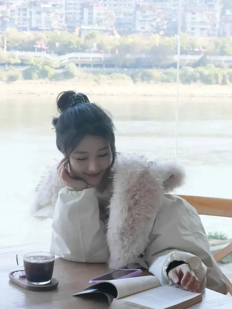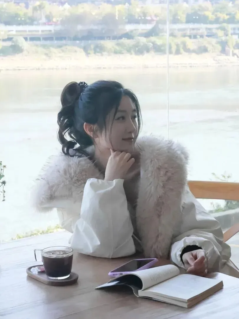 .啡馆里度过.慵懒时光.,米白色.派克服配.浅卡其.打底衫,.毛绒.领子.温暖舒适。深.黑色头发半.扎起来,.露出精致五.官。手里拿着.咖啡、书本和.手机,轻.松拍出日常感.。窗外.有水景和绿.植,加上.暖光滤镜,.氛围特别.治愈。