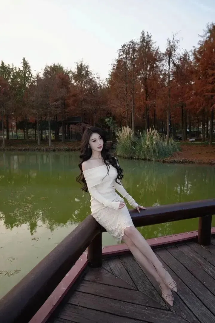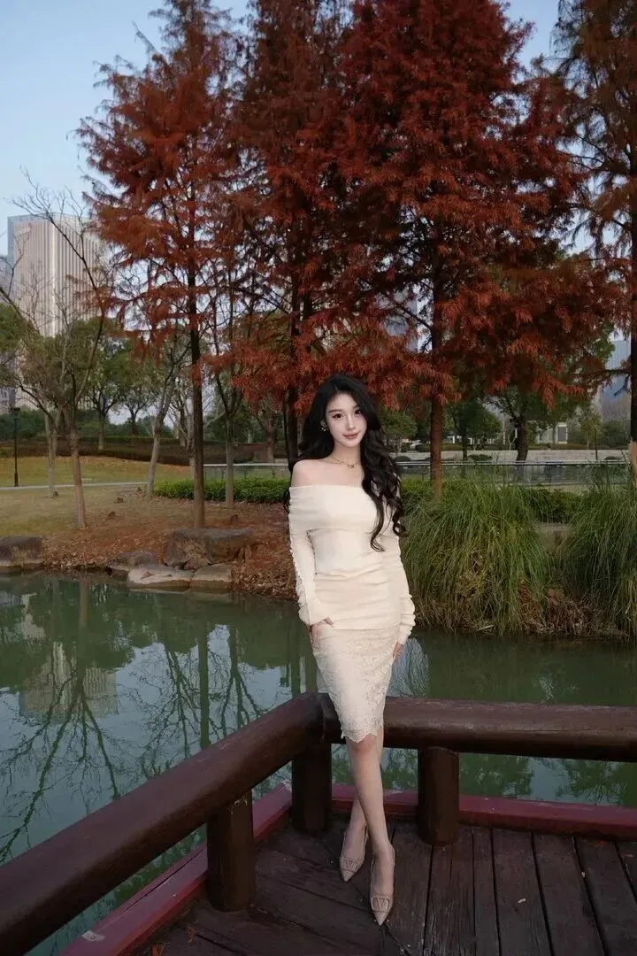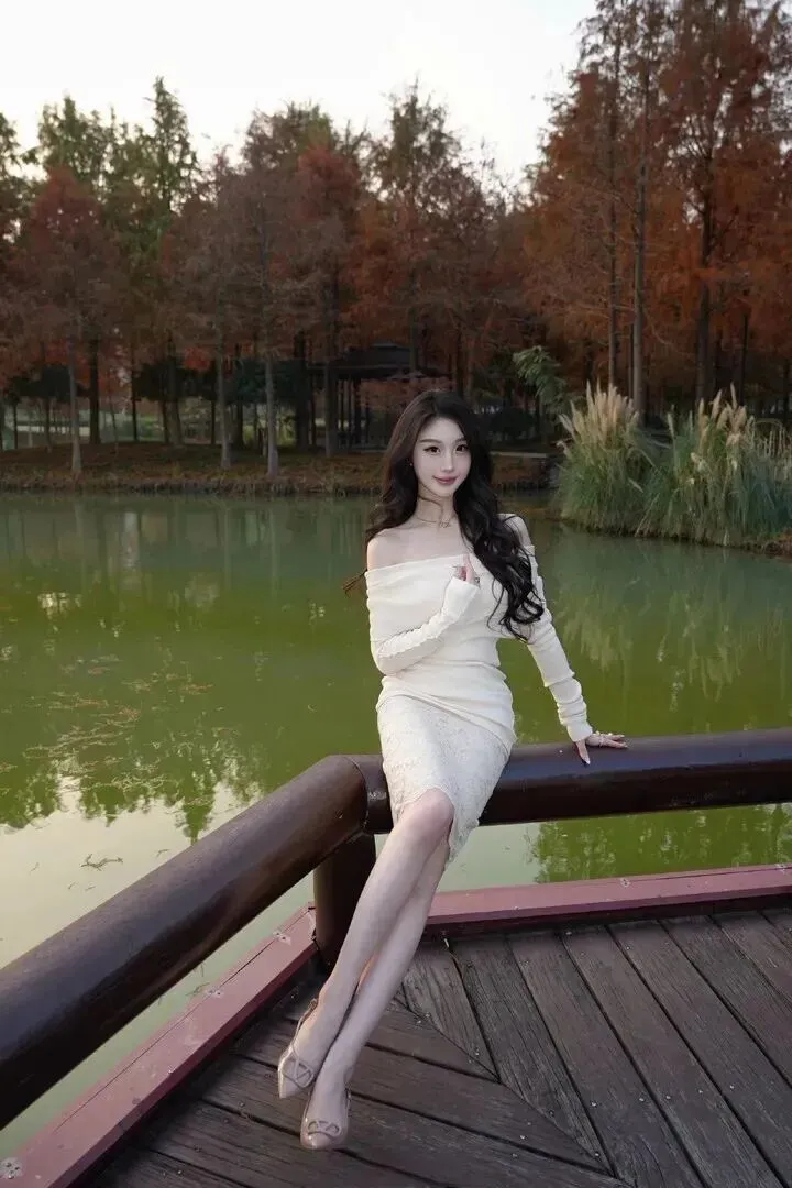 这身搭配选.在秋日.的水杉.林里拍.照,真的太.会选了!.背景是.满满.的红棕色树林.,像打.翻的调.色盘,而她的.米白色穿搭在.中间.显得特.别干.净、温柔。.湖面静静.的,倒映着.树影.,整个画.面像一幅油画.