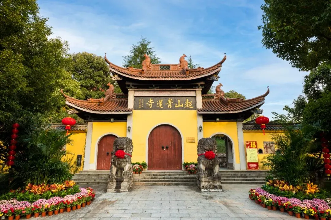 青莲寺,整座寺院坐北朝南,依超山西南山麓而建。1992年1月21日,经杭州市人民政府批准,恢复开放青莲寺。在余杭市政府、塘栖镇政府支持下,于1993年6月12日,正式奠基重建,历时7年,大雄宝殿、天王殿、西方殿、药师殿等先后建成。寺内错落有致,红墙黛瓦在绿树掩映下显得格外庄重而宁静。