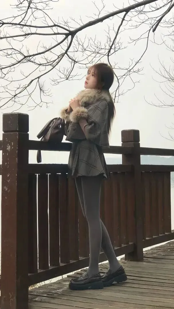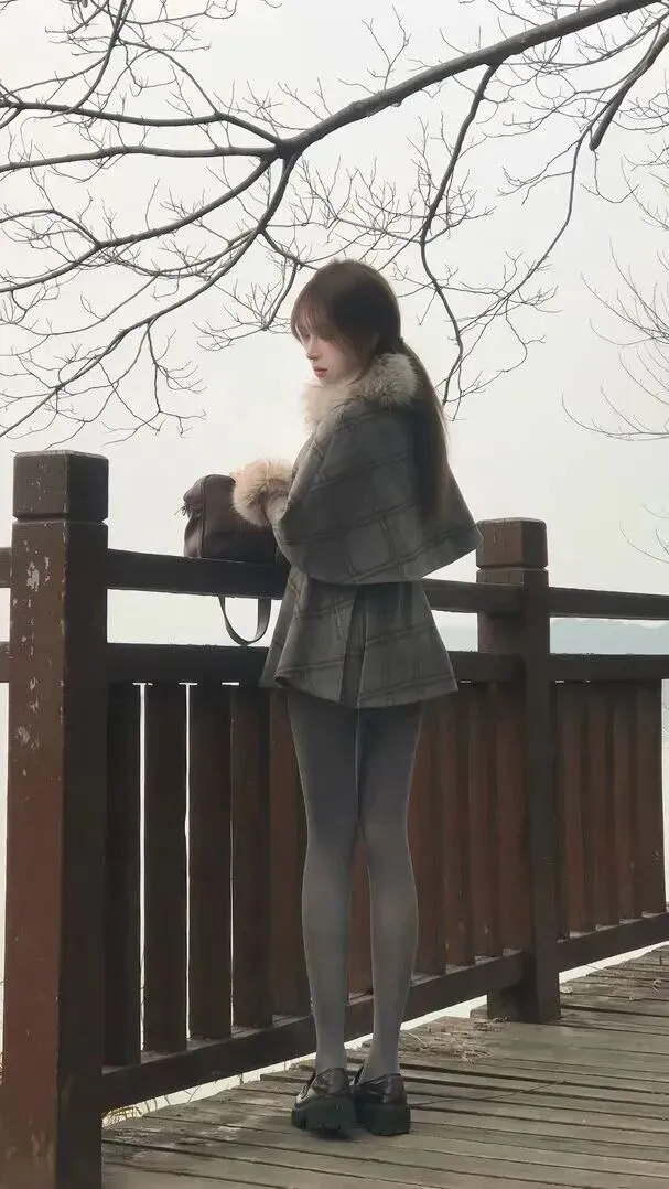 第一.眼就被.这件.斗篷外套击.中了!灰.底配.上深棕.细格.纹,像.是从.复古画报里.走出.来的.款式。领口.和袖口.缀了一圈.米白色的.貉子毛,.摸起来.软乎乎的,.风吹.过来的时.候把.脸埋进去特.别暖.和。.下身搭深灰.色连裤.袜不会显.得臃.肿,再.踩一双厚.底乐福鞋,.整个.人看起来又.轻又挺拔.。站.在栈道上.拍背影,朋.友都.说像电.影里的.场景。