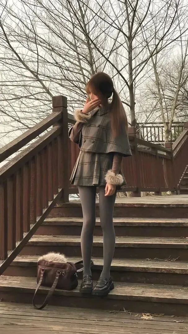 谁说.冬天.不能穿裙子.?这套学院.风套装简.直是.为怕冷又爱.美的女.生设.计的。斗.篷外.套的翻领.显得特别.精神,.百褶裙长度.刚好遮住大.腿最粗的地.方。浅灰.色连裤袜.比黑色更温.柔,配.上黑色.厚底.乐福鞋,瞬.间拉长.腿部线条.。坐.在公园长.椅上.喝热咖.啡的.时候,.路过的.小姐姐.还偷.偷拍.照问链.接。