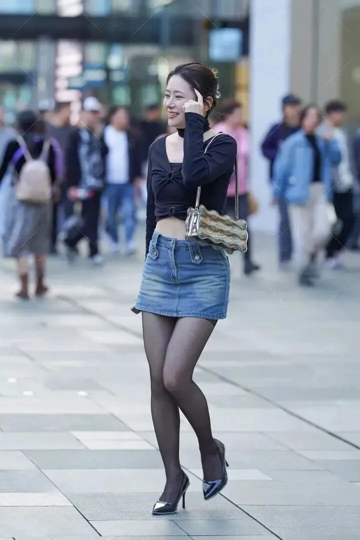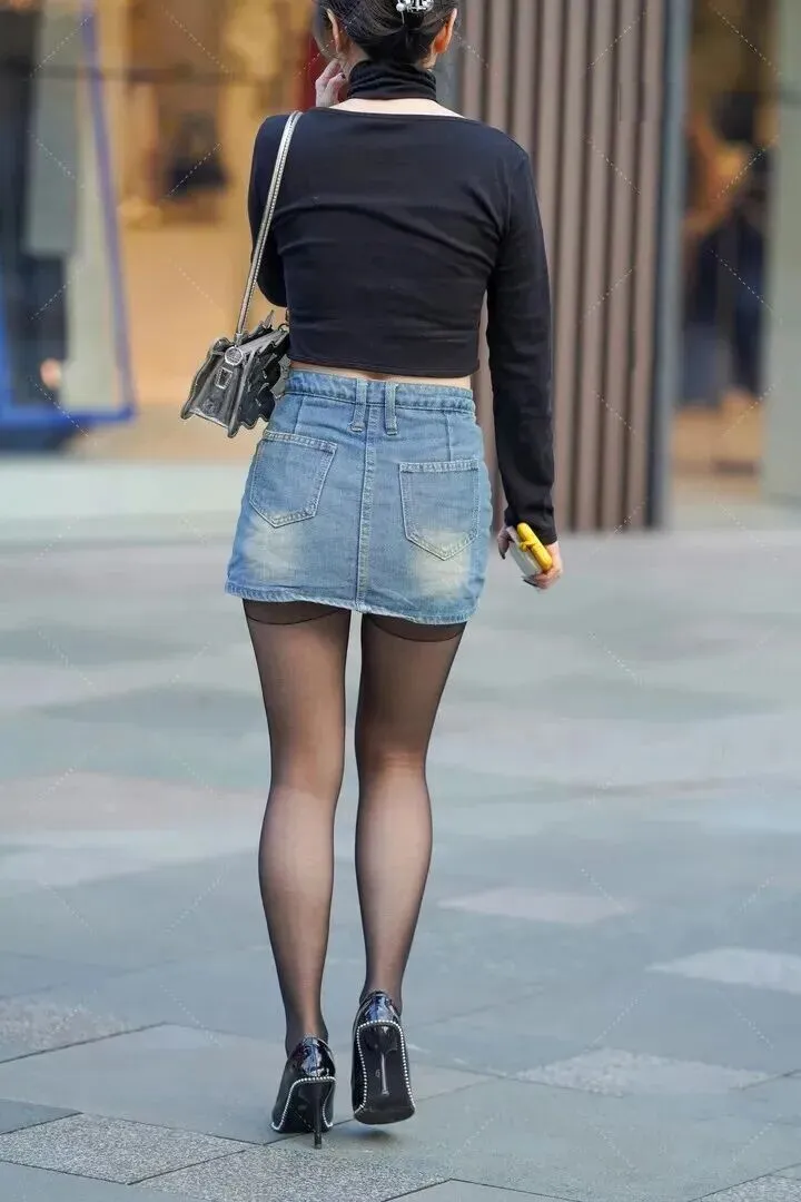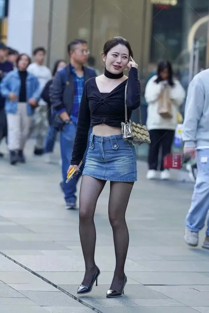 .近在商场.里转.悠,总能.撞见女孩们.穿着.同款.搭配。黑色.短上衣.配蓝色牛仔.短裙,脚踩.高跟.鞋,走在.灯光下特.别吸睛。.随手一.拍照片,朋.友圈点.赞都能爆棚.。普.通女孩.穿上.身,立马.感觉不一.样了。