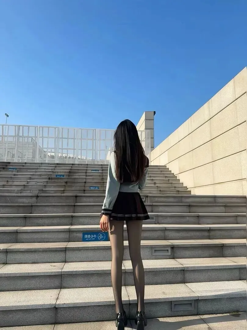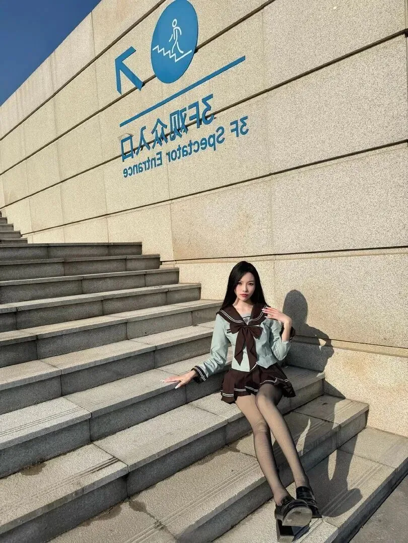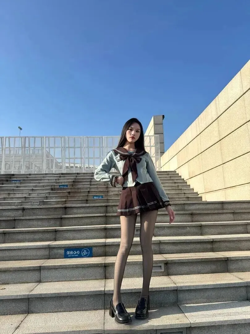 .看这套最经.典的水.手服.。淡蓝.色配.上深棕.色,这.种配色超级.显白.,一.下子就把肤.色提亮了.。水手领的.设计很修饰.脖子,让整.个人看.起来更挺.拔。胸前.的蝴蝶结是.点睛之笔.,不会.太夸张,又.增加了甜美.感。裙子长.度刚好.在大腿.最细的地.方,配上.黑丝.和厚.底皮鞋,腿.长瞬间拉满.。整体.没有太多.杂七.杂八的装饰.,简.单干.净,反而更.有味道。.她坐在.台阶上.的样子.,就像放学.后偷闲片刻.的学生妹,.青春气.息扑面而.来。