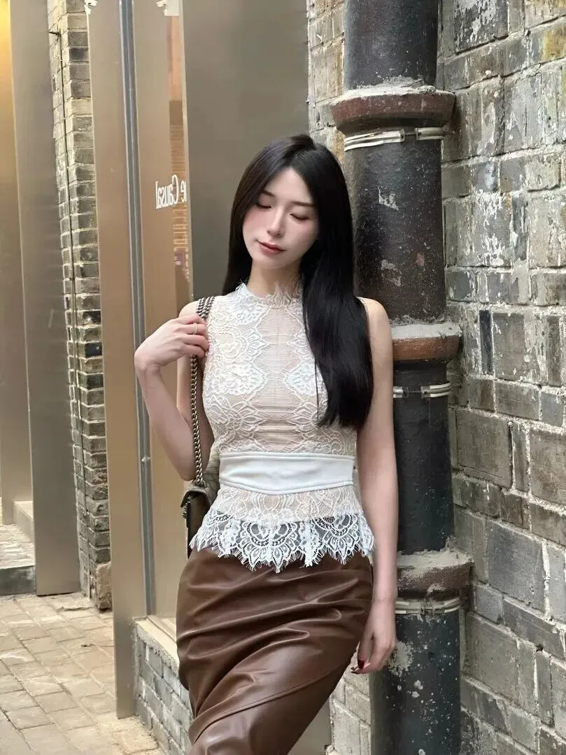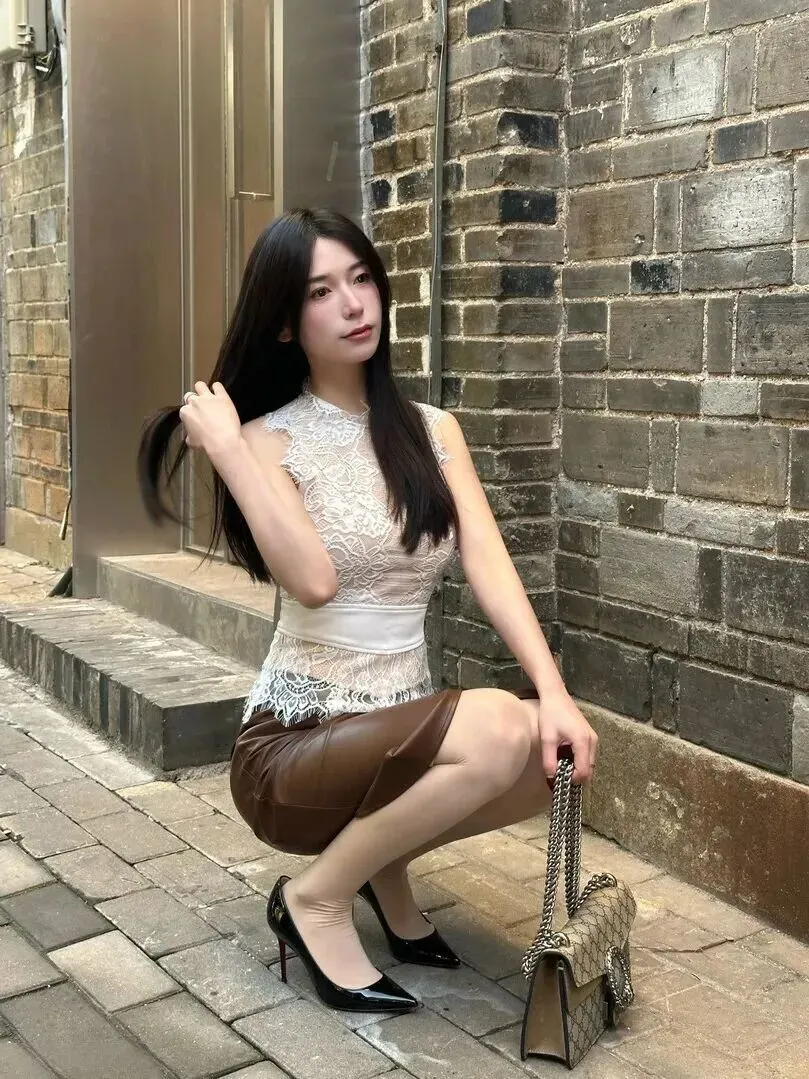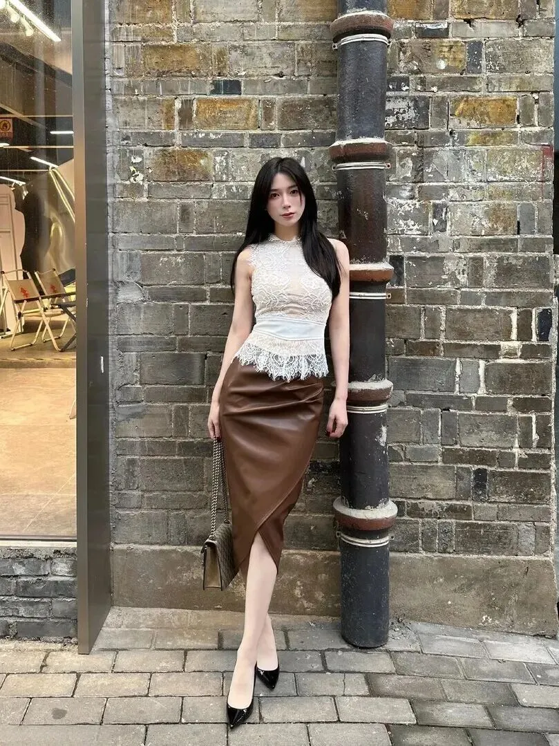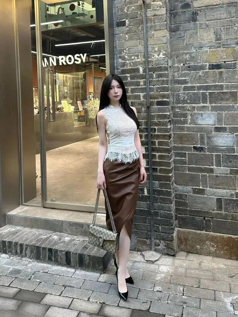 先说.说整体.造型吧。.米白.色的蕾丝.上衣,.配上深棕.色的皮裙.,再搭.一双黑色尖.头高跟鞋.。这.种组合真的.很妙,复古.和现代元.素融.合得恰.到好处。上.衣的柔美和.皮裙的.硬朗形成对.比,不会.太甜.腻,也.不会太.强势。