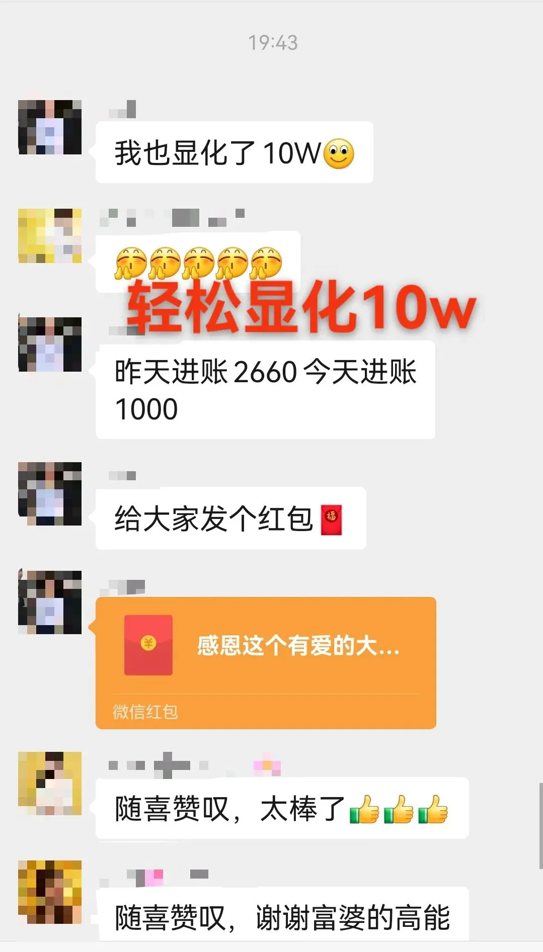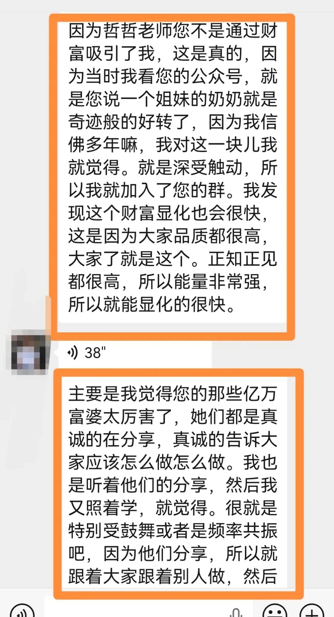 因为哲哲老师您不是通过财富吸引了我,这是真的,因为当时我看您的公众号,就是您说一个姐妹的奶奶就是奇迹般的好转了,因为我信佛多年嘛,我对这一块儿我就觉得。就是深受触动,所以我就加入了您的群。我发现这个财富显化也会很快,这是因为大家品质都很高,大家正知正见都很高,所以能量非常强,所以就能显化的很快。