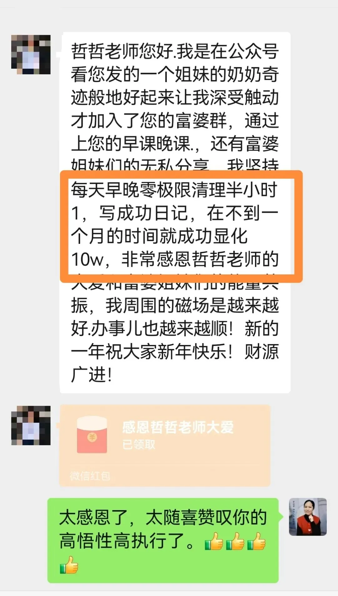 通过上您的早课晚课.,还有富婆姐妹们的无私分享,我坚持每天早晚零极限清理一个半小时,写成功日记,在不到一个月的时间就成功显化10w,这10w完全是意外惊喜。