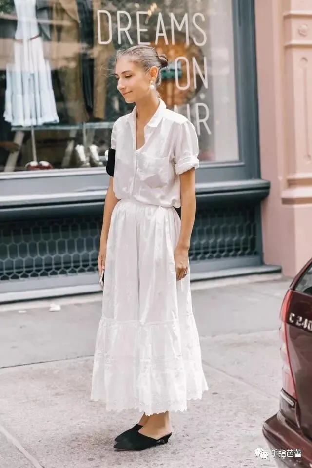 另外选择一字领露肩款或者开叉设计的排扣款小白裙,可以更好的转移视觉重心,体现完美的身材比例,显高显瘦又可以极尽法式优雅,清爽撩人别具一番韵味风情。