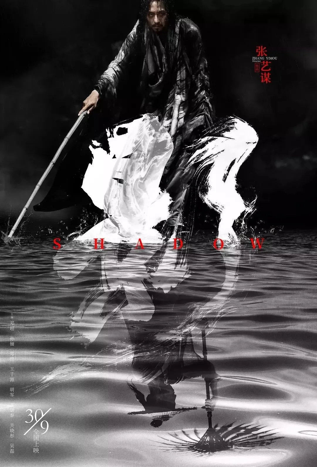 海报中的水墨黑白流淌,太极图,油纸伞...中国元素尽显姿彩,“影”字如飞舞的流云,笔锋挥洒,飘逸的剑气释出,仿佛透露着与影片有关的丝丝风声。
