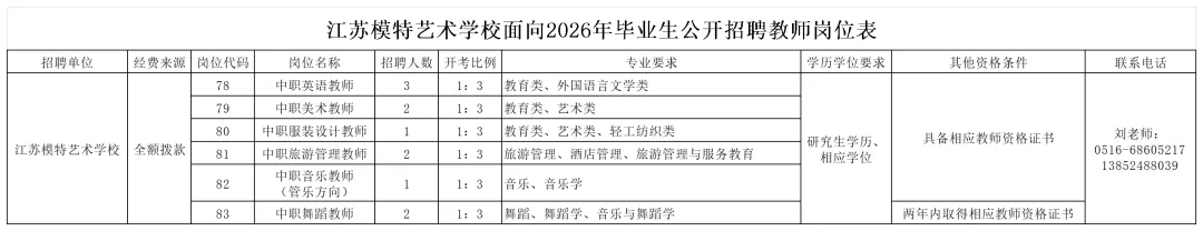 江苏模特艺术学校面向2026年毕业生公开招聘教师公告