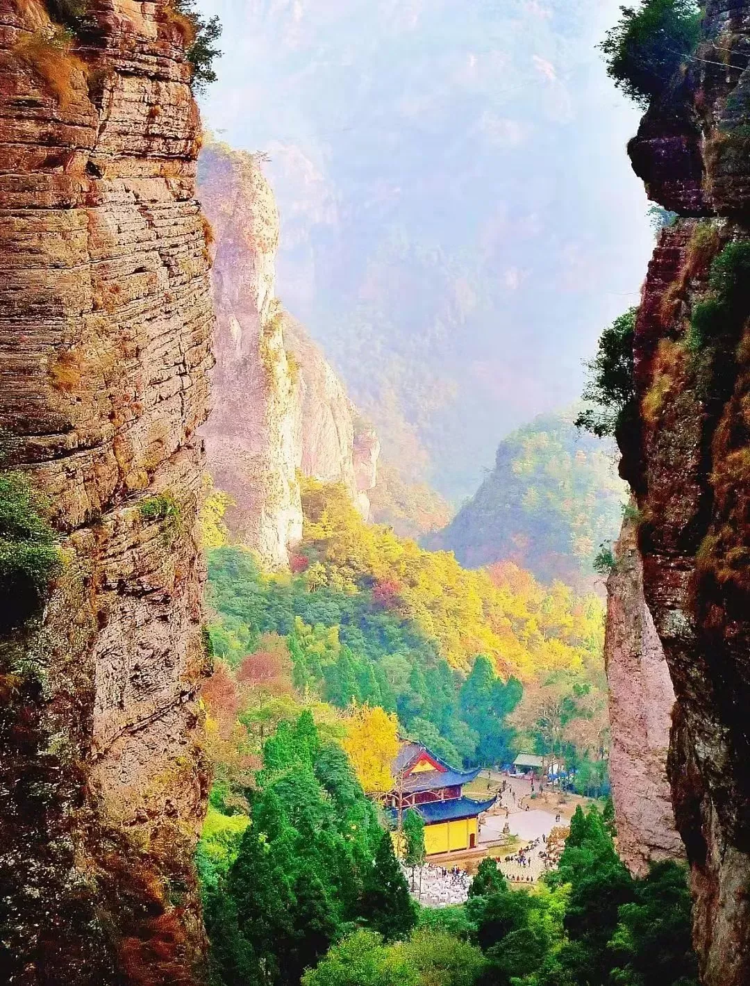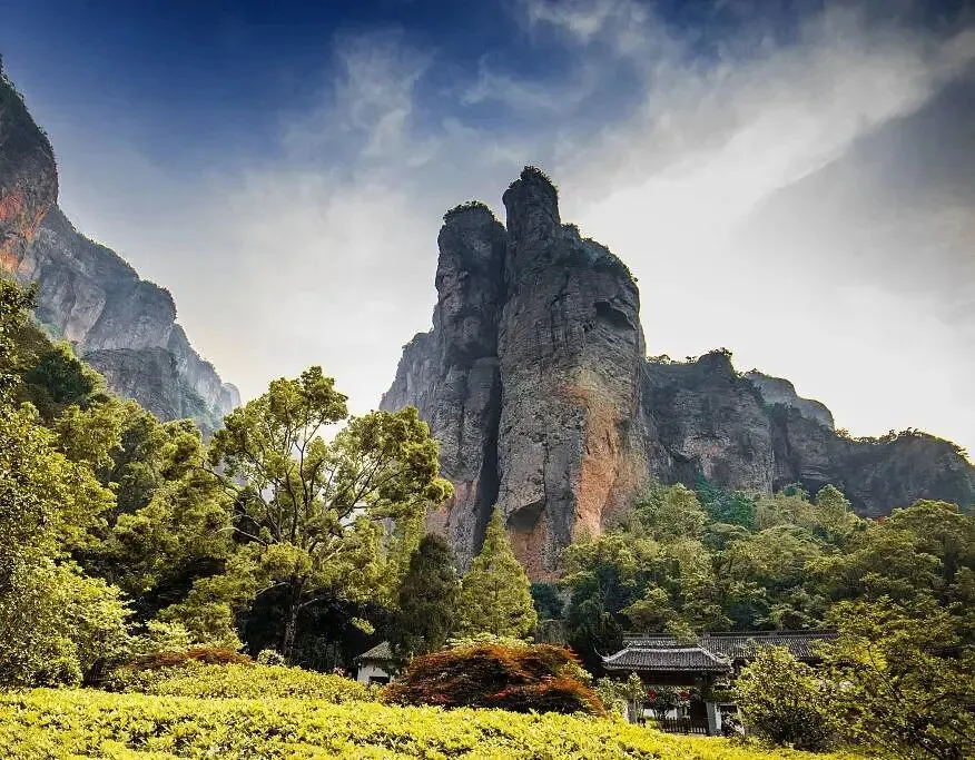 人们视其为雁荡山的“明庭”。以灵岩古刹为中心,后有灿若云锦的屏霞嶂,左右天柱、展旗二崖对峙, 壁立千仞。因“浑庞”而生肃穆,人处其中,顿觉万虑俱息。