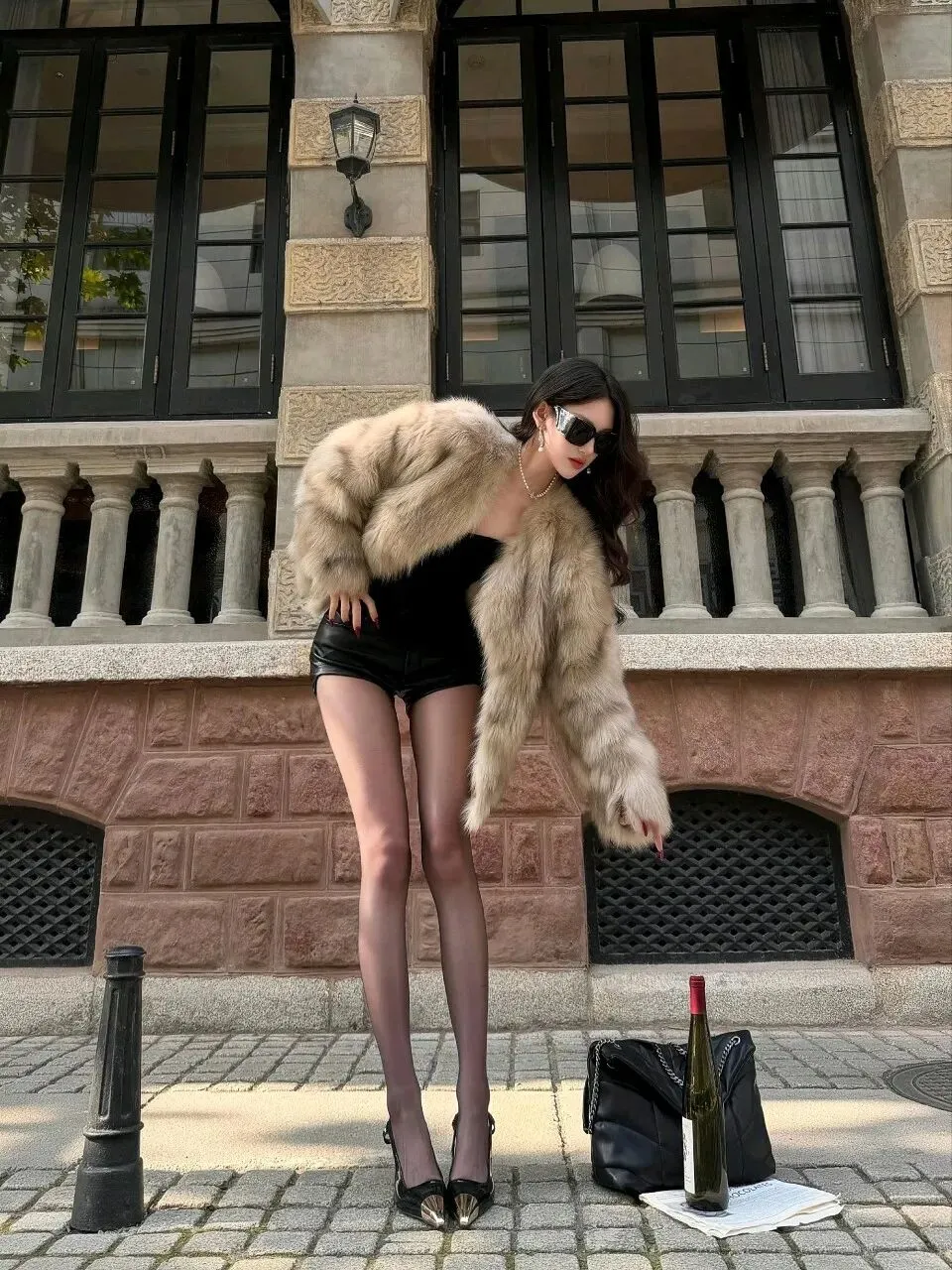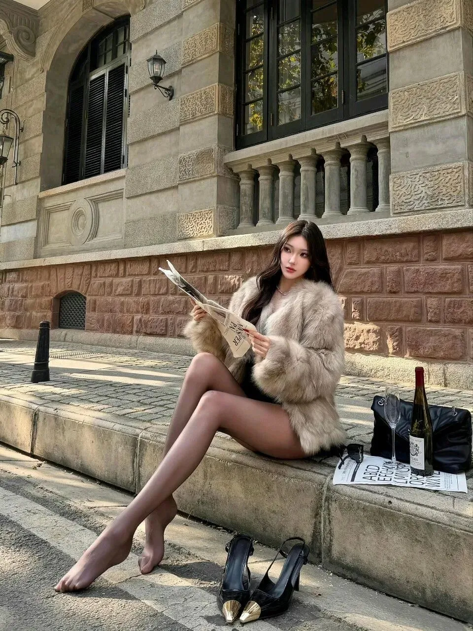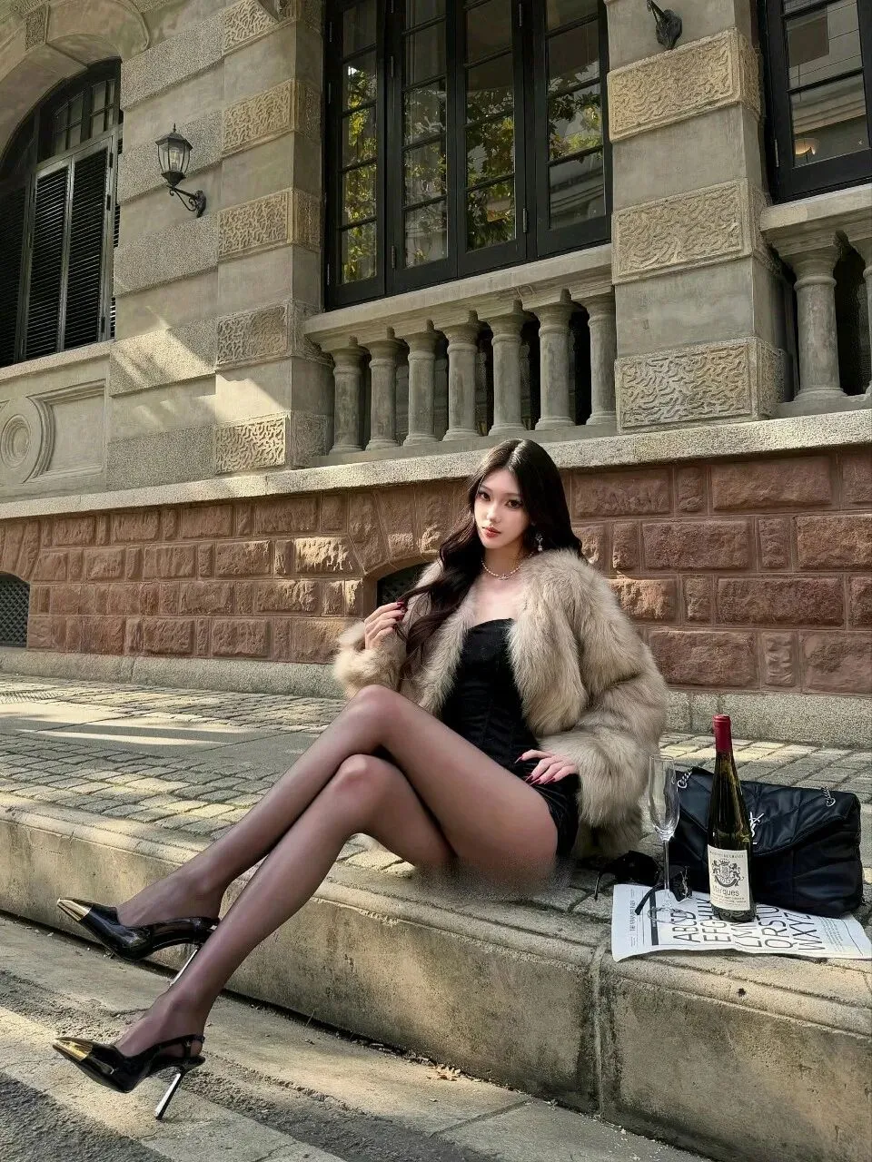 如果说皮草与内搭是这套穿搭的"主菜",那么黑色丝袜与尖头高跟鞋则是必不可少的"调味料"。黑丝的微透效果在视觉上拉长并修饰了腿部线条,让双腿在皮草的衬托下显得更加笔直修长。它将性感的氛围从内搭延伸到全身,成为连接上衣与鞋子的完美过渡。