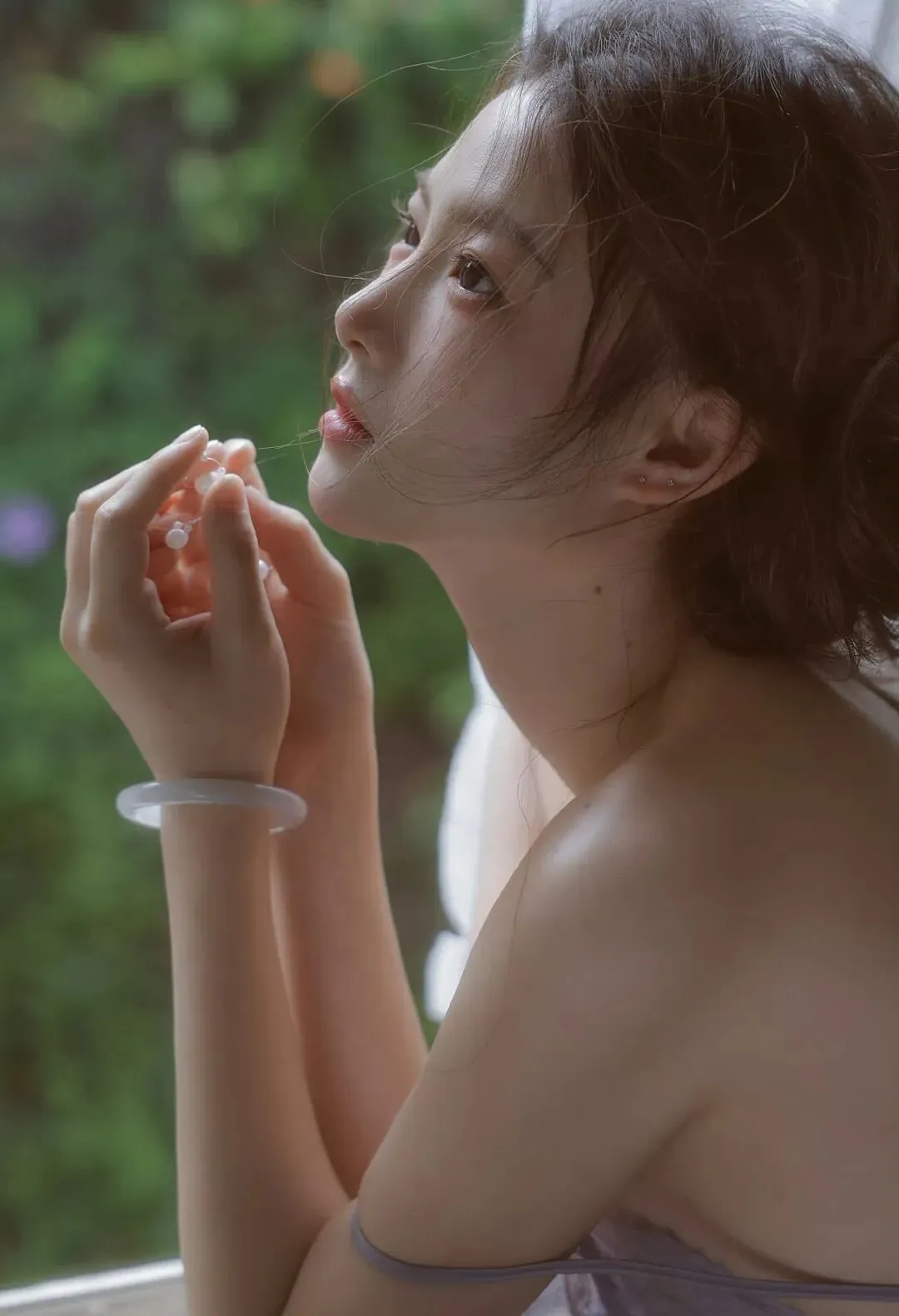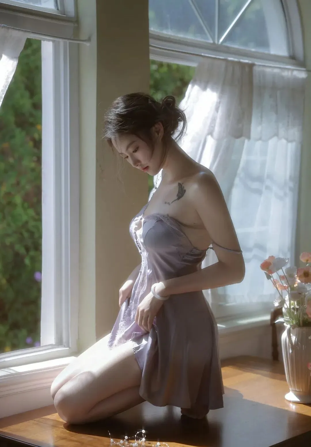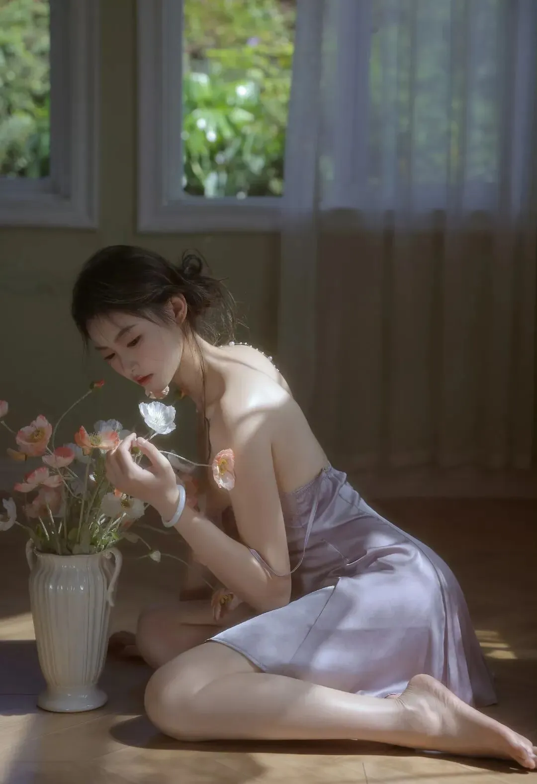 画面里的她穿着一件浅紫色真丝吊带睡裙,蕾丝花边在布料上泛着细腻的柔光。裙身剪裁松弛又贴合,既勾勒出柔和的身体线条,又不会显得刻意性感。头发随意挽成低髻,几缕碎发被阳光照得发亮,贴在颈窝和脸颊,带着点慵懒的凌乱。最打动人的是她的状态:一会儿跪在地板上,指尖捏着一朵虞美人凑近鼻尖,睫毛垂落的阴影落在眼下;一会儿蜷在复古绒布沙发里,仰头闭眼,让阳光漫过锁骨与肩颈,整个人松弛得像一滩融化的奶油。