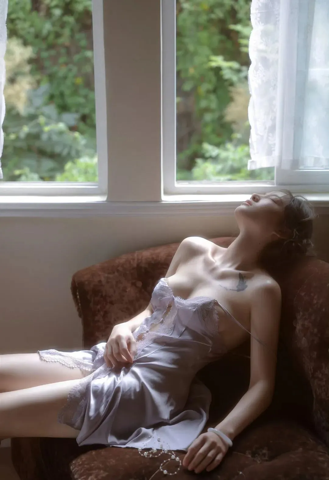 不同于千篇一律的网红写真,这组照片里全是真实的细节。她的手臂自然搭在沙发扶手上,没有刻意收紧线条;脖颈弧度随着呼吸轻轻起伏,不是僵硬的摆拍角度;连锁骨上的蝴蝶纹身,都在光影里若隐若现,成为恰到好处的点缀。这种不刻意的真实感,让整个系列都透着“生活流”的温柔——就像推开闺蜜房门,撞见她刚睡醒的模样,带着惺忪慵懒,却比精心打扮更动人。
