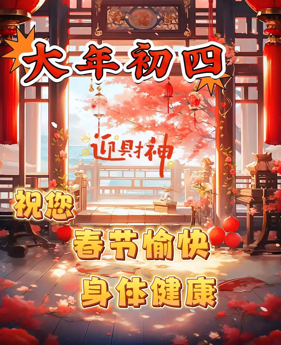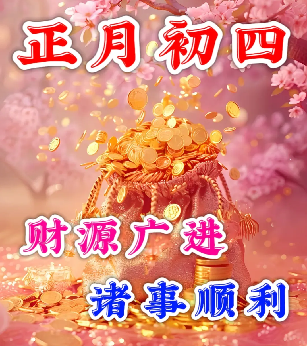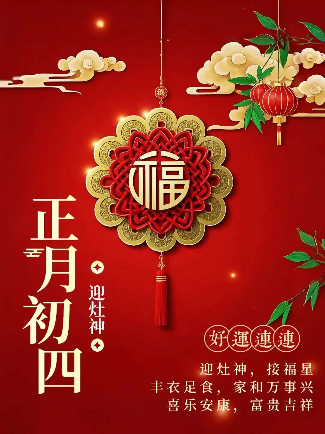 初四吉祥幸福前,财神到来福满天。健康平安护佑你,幸福快乐围绕身。初四快乐笑开颜,事业进步锦绣年。福气吉祥和顺利,幸福康泰乐久远。