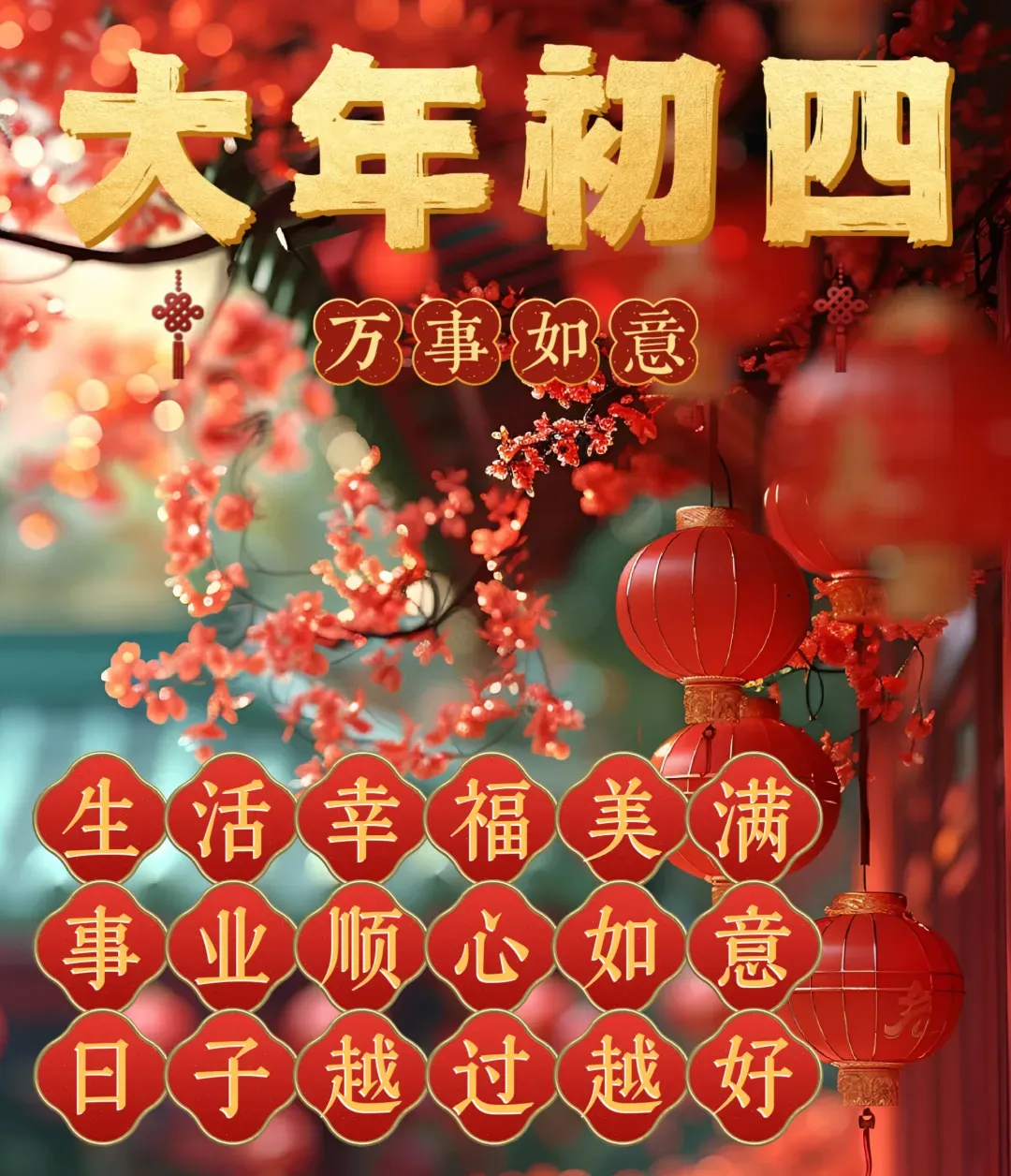 初四阳光照满山,吉祥如意春风荡。五福临门喜洋洋,好运连连福满盘。过年好时光甜蜜,欢声笑语乐开怀。美满幸福永相伴,初四愉快又如愿!