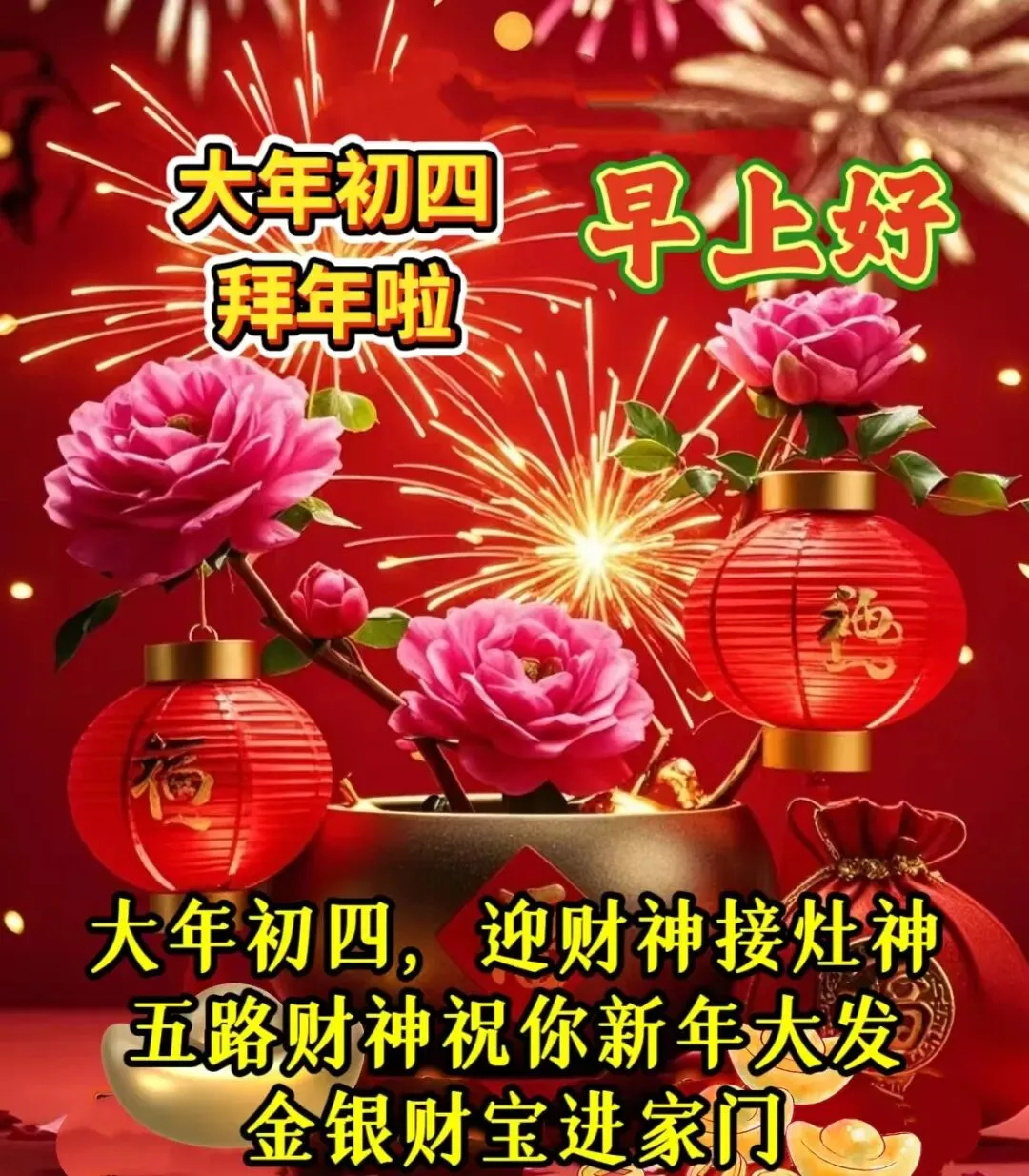 早上好,亲爱的朋友。今天是大年初四,拜个年,问声好。福禄寿喜来拜访,其乐融融喜团圆。今天收到这份祝福的人,注定2026年一整年里,福星高照,万事顺心。