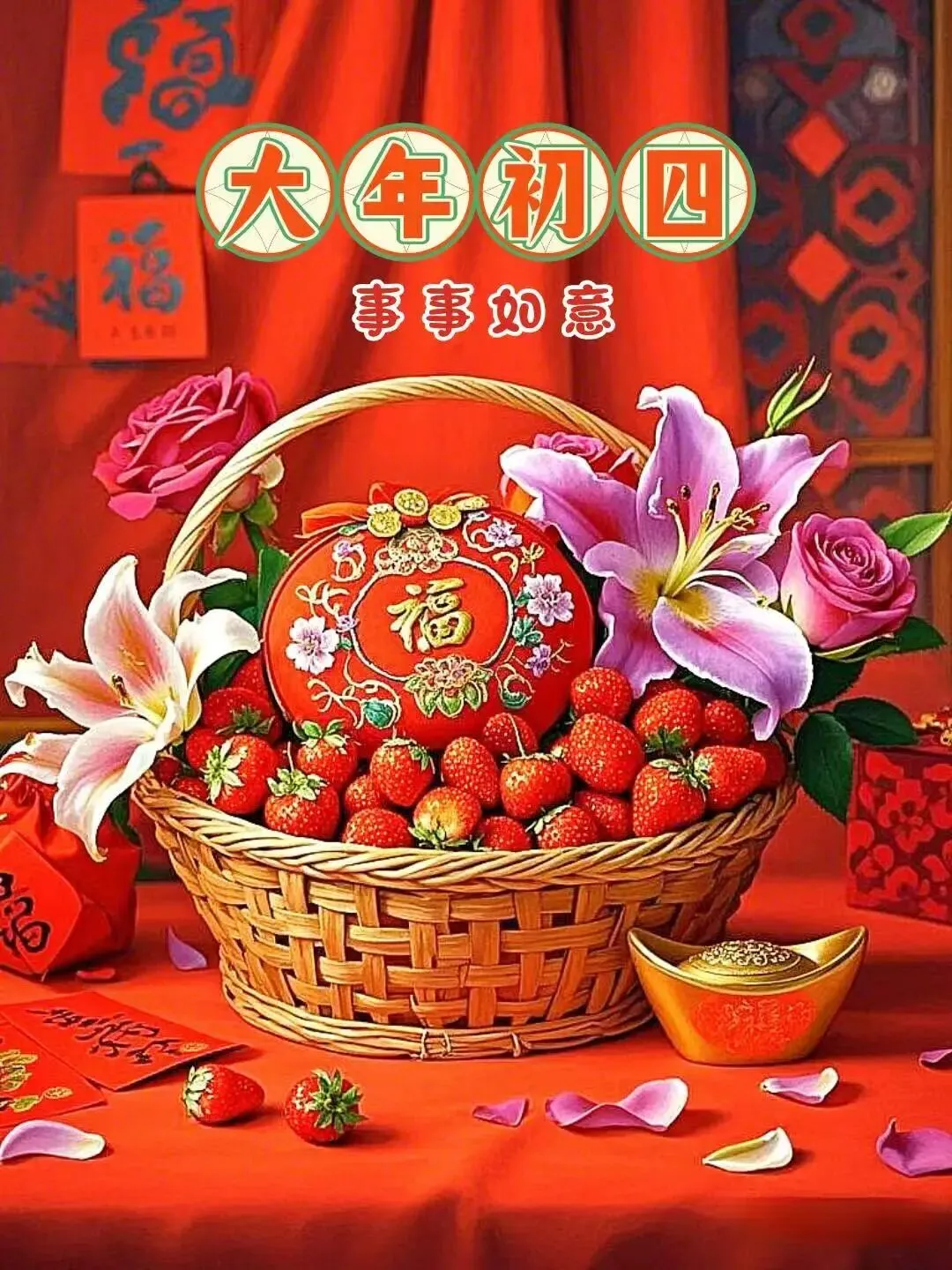 正月初四祝福来了啦,好事如意喜连连。健康快乐随时刻,财运亨通赚满篮。爱情甜蜜情依恋,友谊长存情义浓。初四快乐喜庆天,幸福快乐围身边。