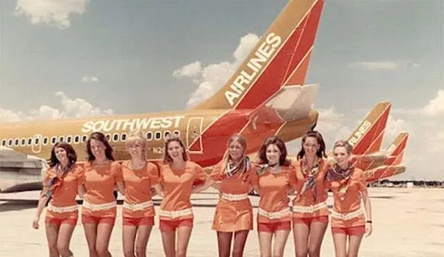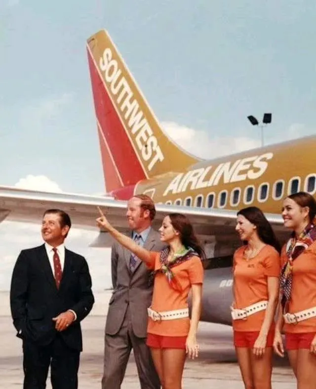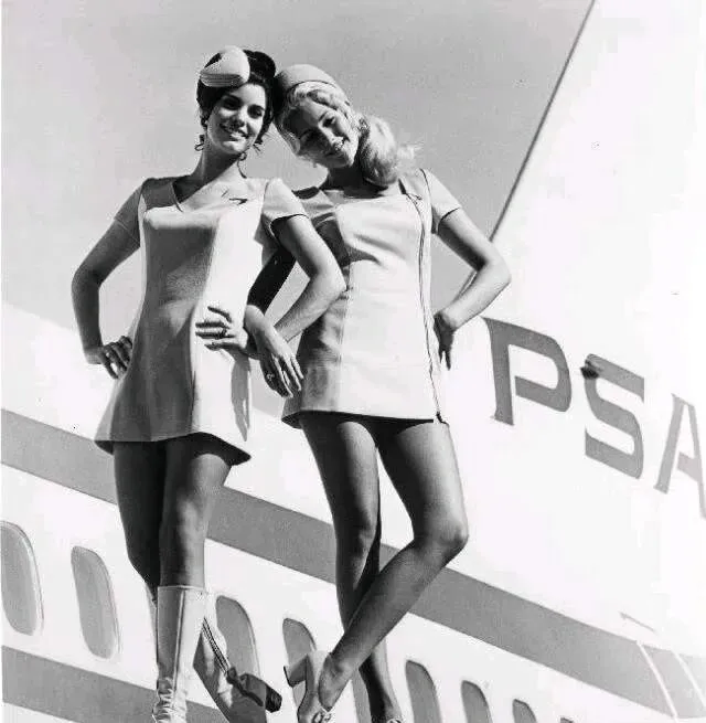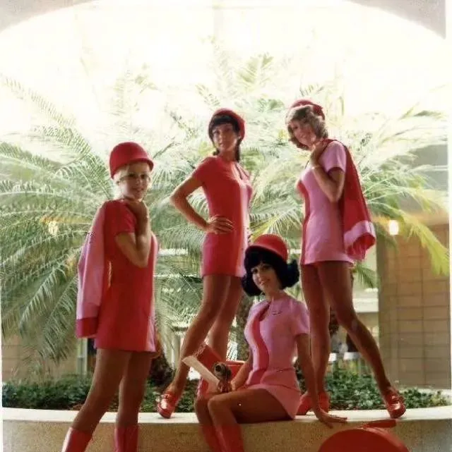 那会儿坐飞机不光是赶路呀,更像进了一个会移动的时装秀场,登机口一亮相就是亮橙亮粉的色块扑面而来,热裤短裙配长靴,个个笑成一束阳光,别说服务了,光走过来那一排步伐就把人看愣了,我第一次见到这类老照片时心里直嘀咕,航空公司这是按模特线挑的人吧。
