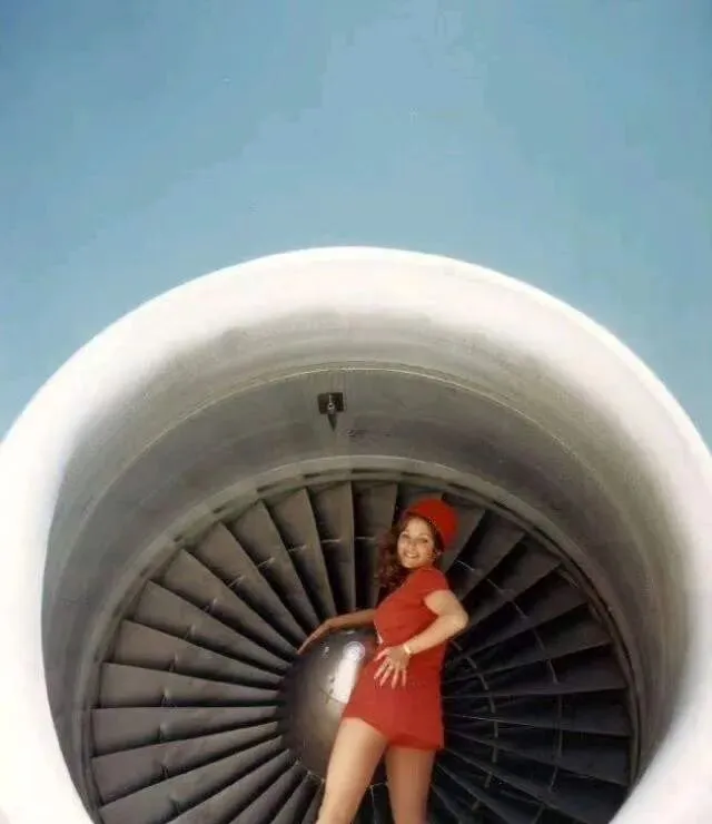 这个位置可叫风扇叶圈,姑娘站在发动机整流罩里,背后是一圈圈扇叶,金属灰发冷,她的裙子一暖一冷刚好对冲,看着胆儿挺大,其实那会儿飞机静置检修,摄影师挑着光位拍,成片比什么棚拍都有张力,现在安检更严规矩更多,谁还会往发动机里摆造型,照片就成了时代的留影。
