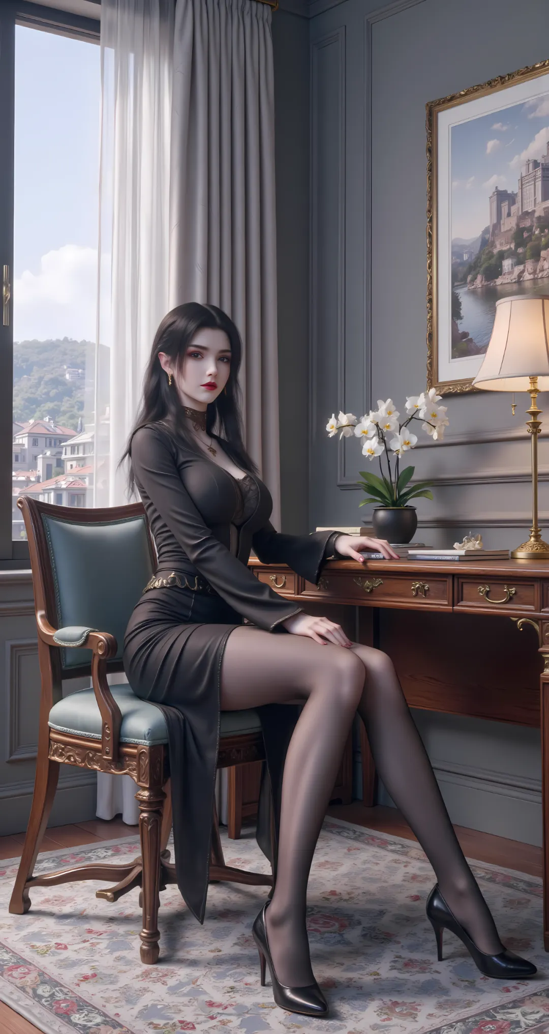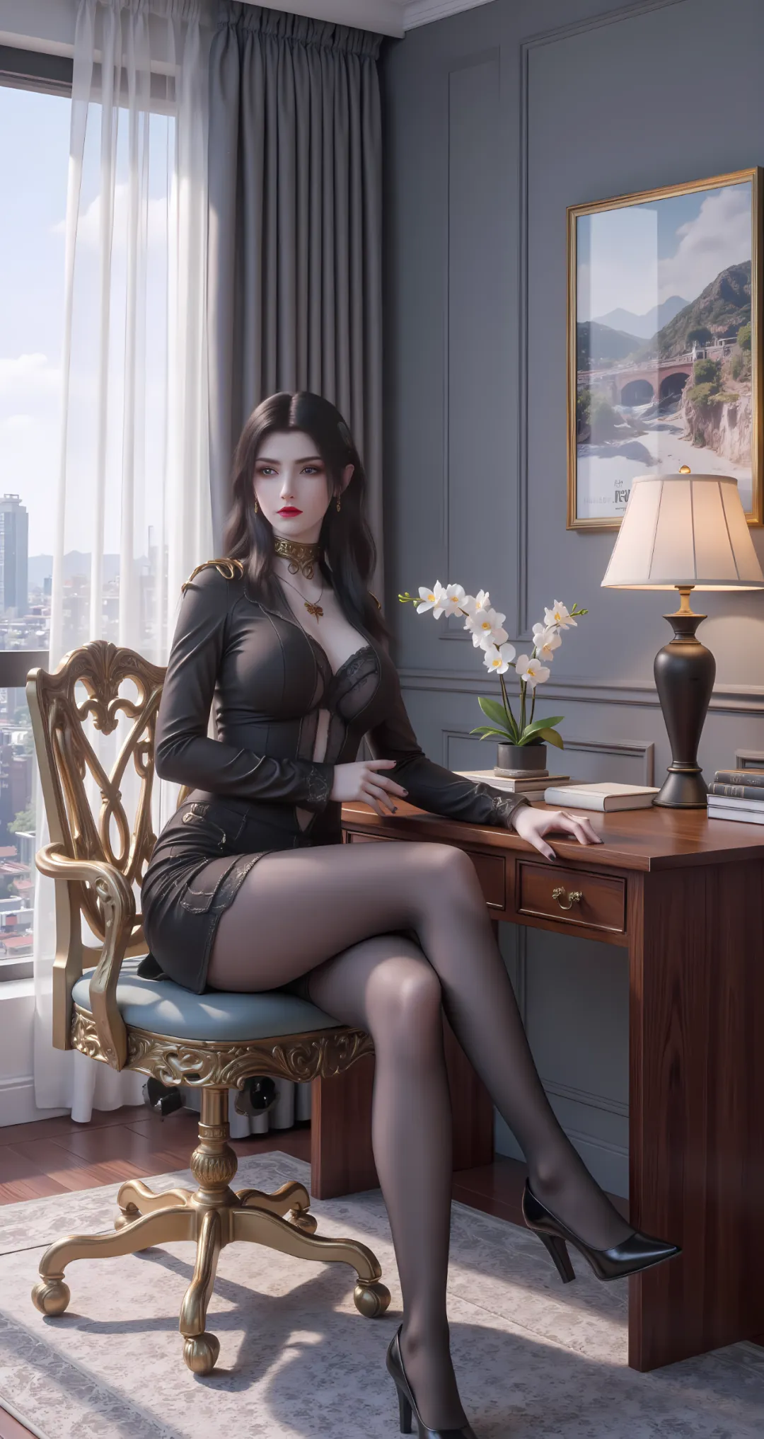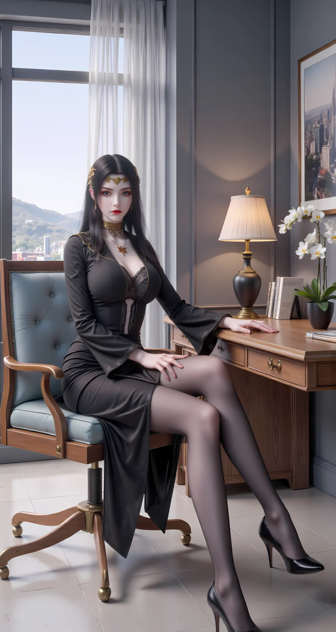 一头紫色长发如瀑布般垂落至腰际,发丝浓密顺滑,泛着琉璃般的光泽,发质柔软却带着几分韧性,末端偶尔会浮现出细小的青紫色蛇鳞,是血脉力量的具象化体现,随风轻轻晃动时,宛如紫色的霞光流转,妖异而动人。平日里,长发随意披散在香肩与后背,不做过多修饰,唯有一枚简单的金色蛇形发簪束起头顶少许发丝,露出光洁的额头与眉心的蛇形印记,更显冷艳与桀骜。此时的她,美如“沙漠毒蝎”,冷艳中藏着野性,霸气中透着决绝,是让人不敢亵渎的孤高女王,那份与生俱来的妖异与威严,足以让任何强者为之忌惮。
