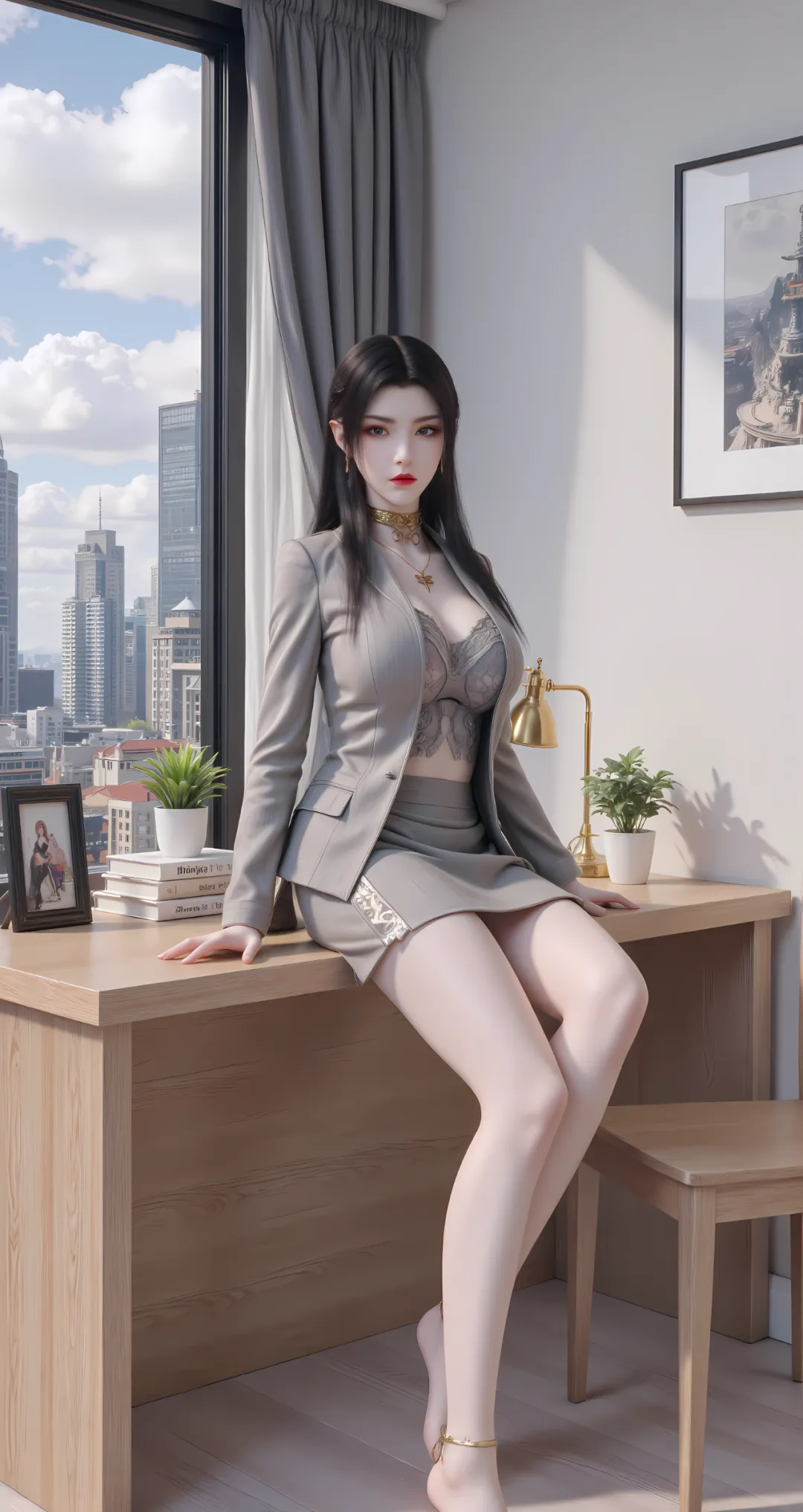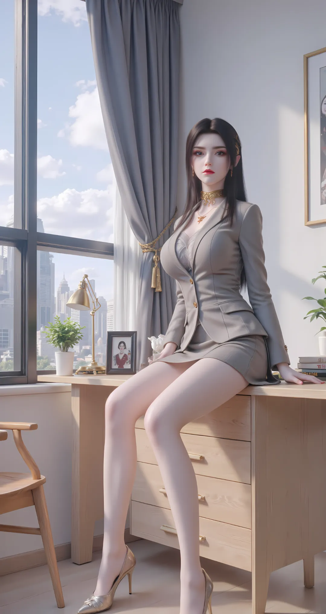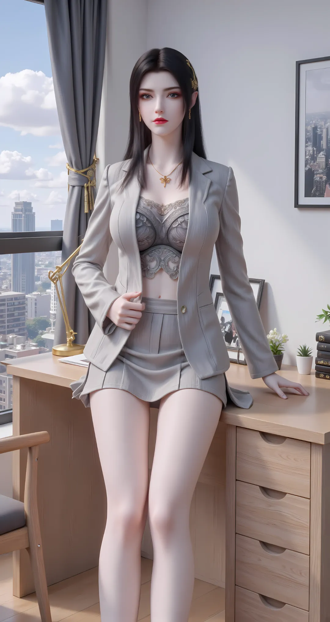 身形高挑挺拔,约一米七五左右,肩背线条如刀刻般利落,兼具女性的窈窕与战士的凌厉,每一寸曲线都恰到好处,既有成熟女子的丰满玲珑,宛如成熟的蜜桃般透着淡淡的妩媚,又有战士的挺拔与力量感,腰肢纤细却充满爆炸性的斗气力量,完美诠释了“力量与美感的统一”。肌肤是冷调的瓷白,似被沙漠月光浸润而成,泛着淡淡的莹润光泽,细腻如凝脂,却因长期执掌杀伐、历经风沙洗礼,透着一股生人勿近的疏离感,锁骨线条分明,肩颈曲线优美,抬手投足间,尽显女王的矜贵与冷傲。