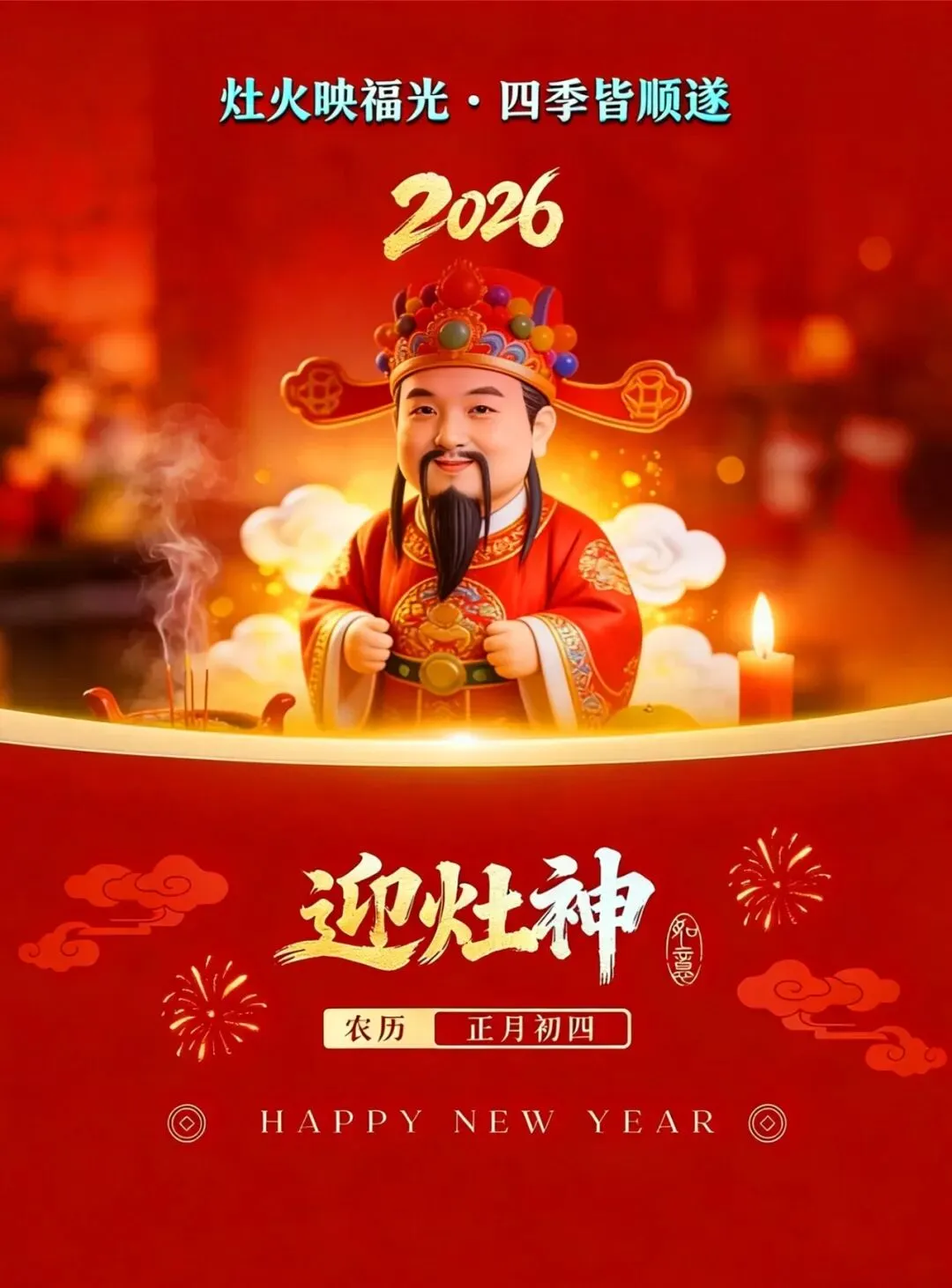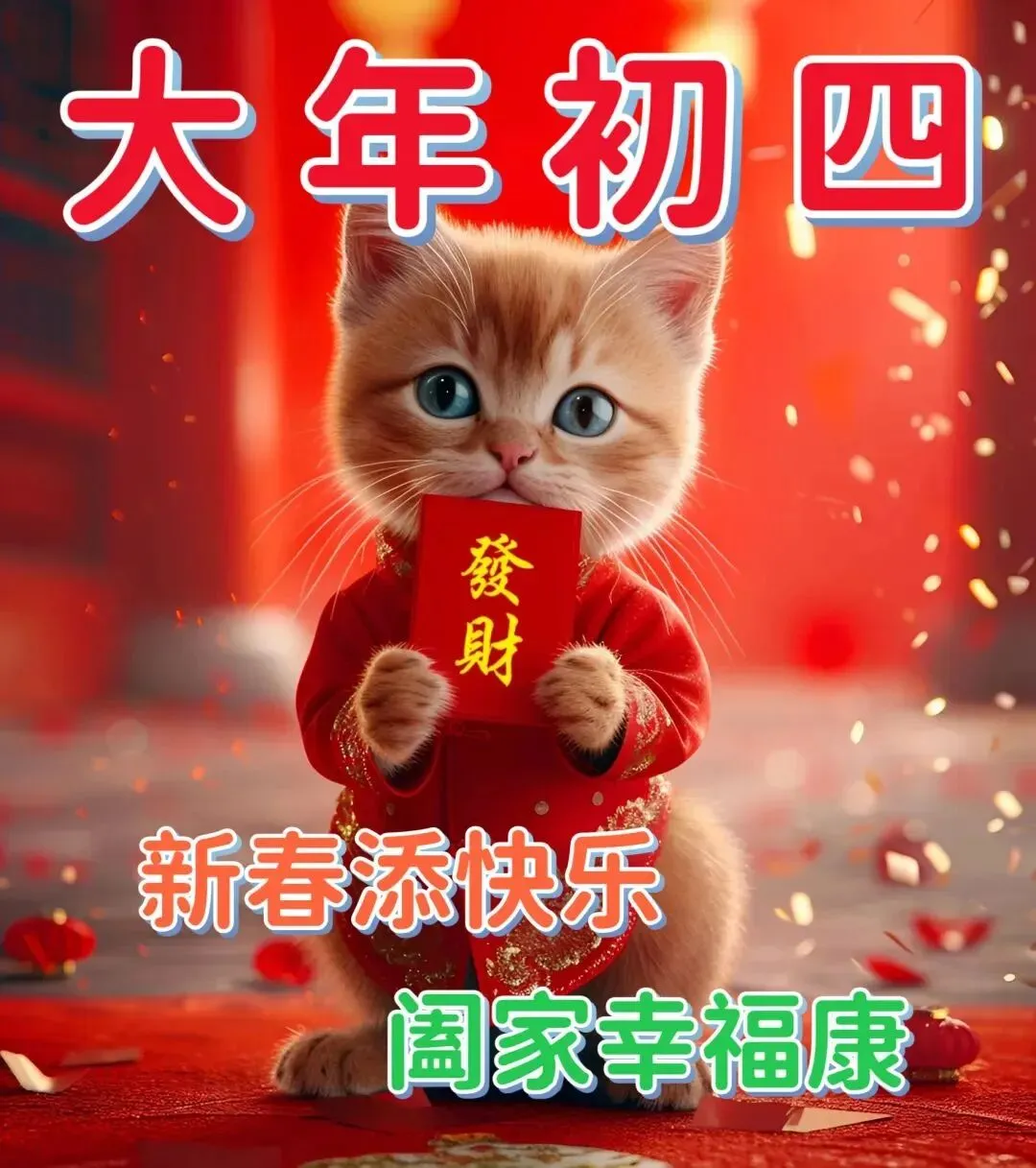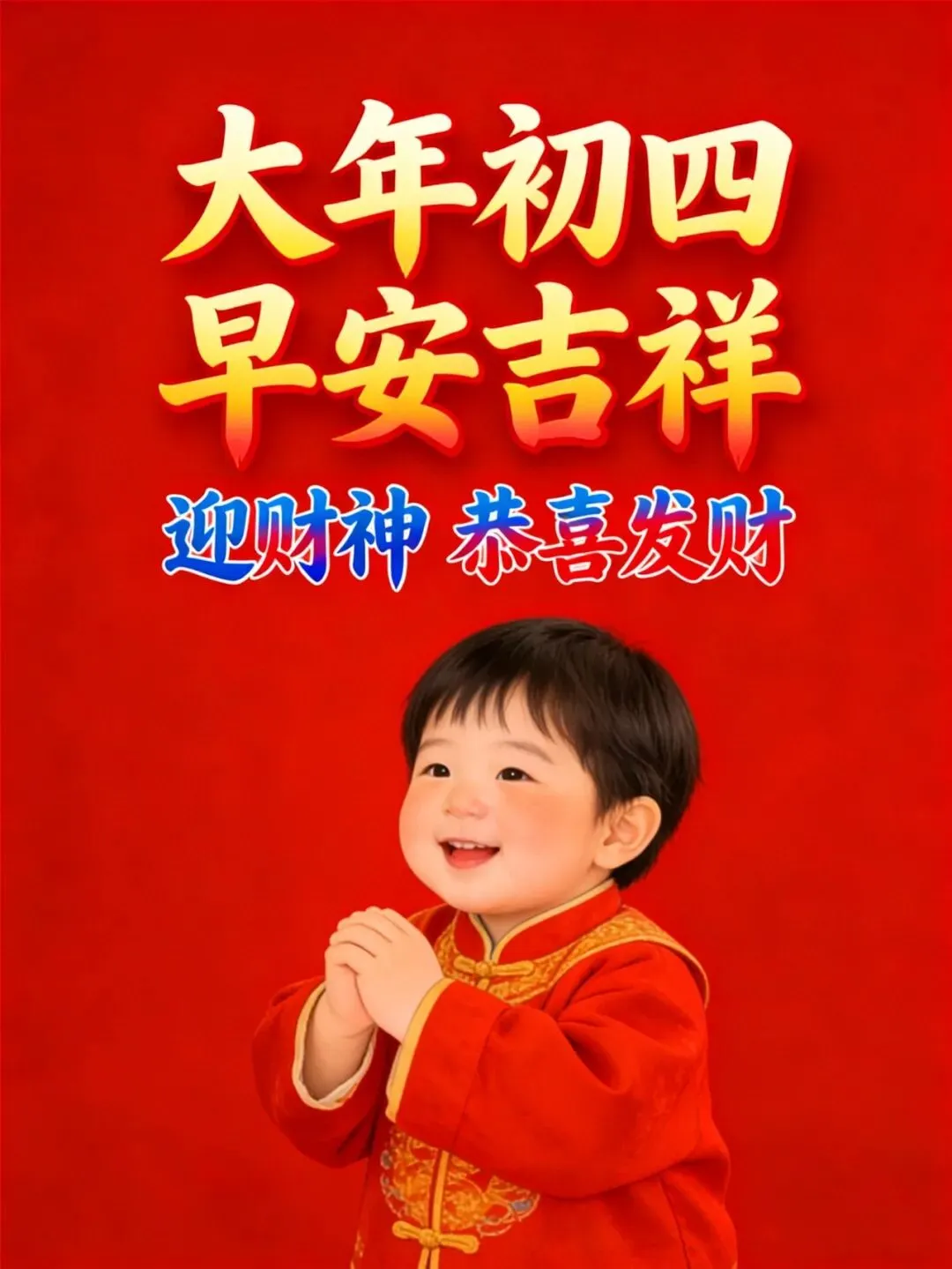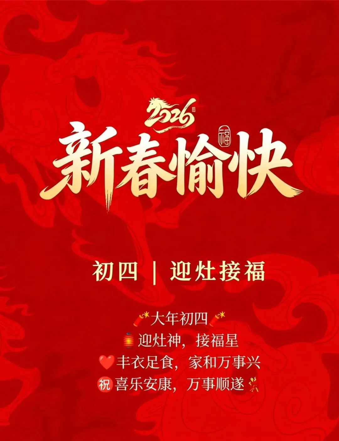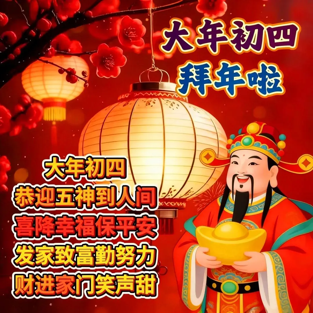今天是大年初四,拜个年,问声好。福禄寿喜来拜访,其乐融融喜团圆,今天收到这份祝福的人,注定2026年一整年里,福星高照,万事顺心!