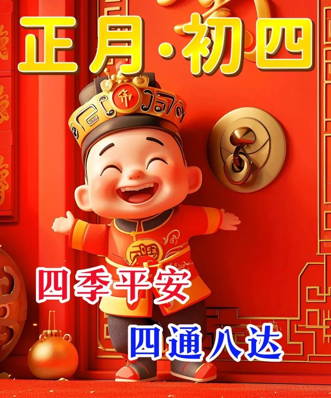 今天是正月初四,愿亲人朋友们:岁岁吉祥,年年有余,四季平安,万事如意,好运一年接一年。愿您生活无忧愁,事业无困难,日子红红火火,一年更比一年好!