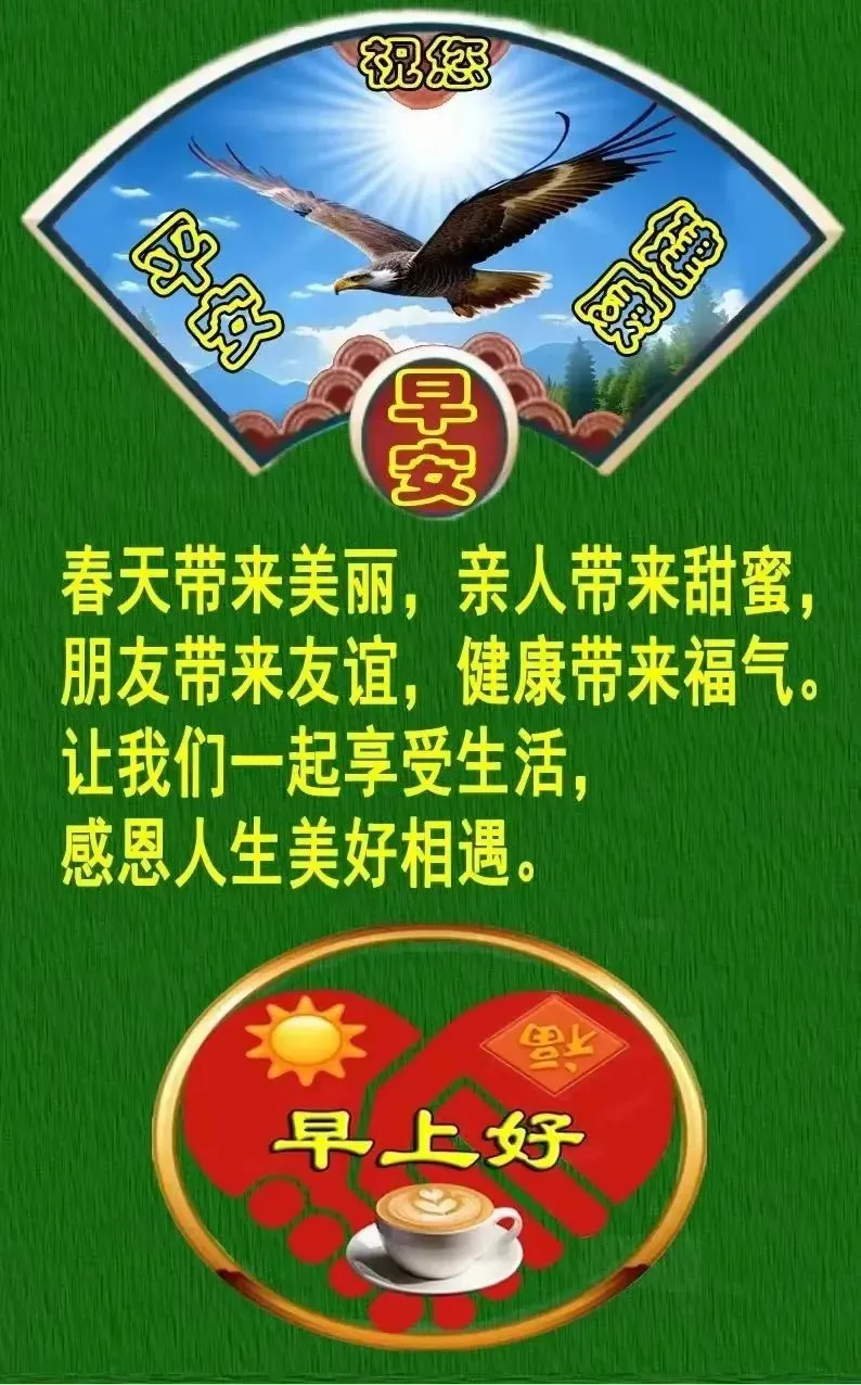 18、人生渴望安康,开心就是良方;每天打个招呼,心情特别舒畅;微语你来我往,友情地久天长!愿我们:天天快乐,日日安康!🌹🙏❤️☕️🎉