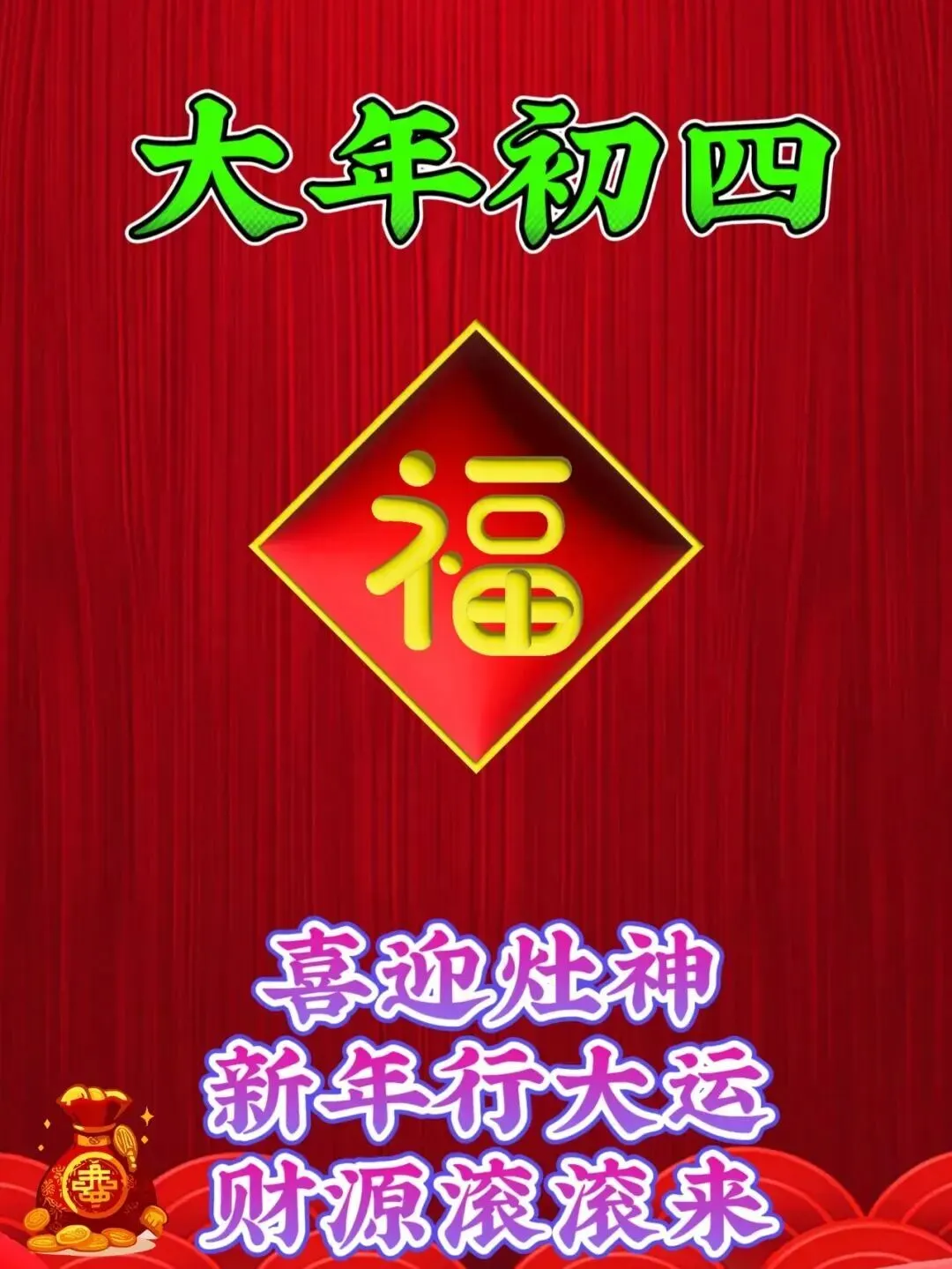大年初四,头份祝福,喜气洋洋送吉祥。一送,好运不可挡,天天赚钱幸福忙。二送,温情心中藏,朋友之间莫相忘。三送,福禄与健康,愿你身体强又壮。四送,幸福万年长,祝你快乐又安康。