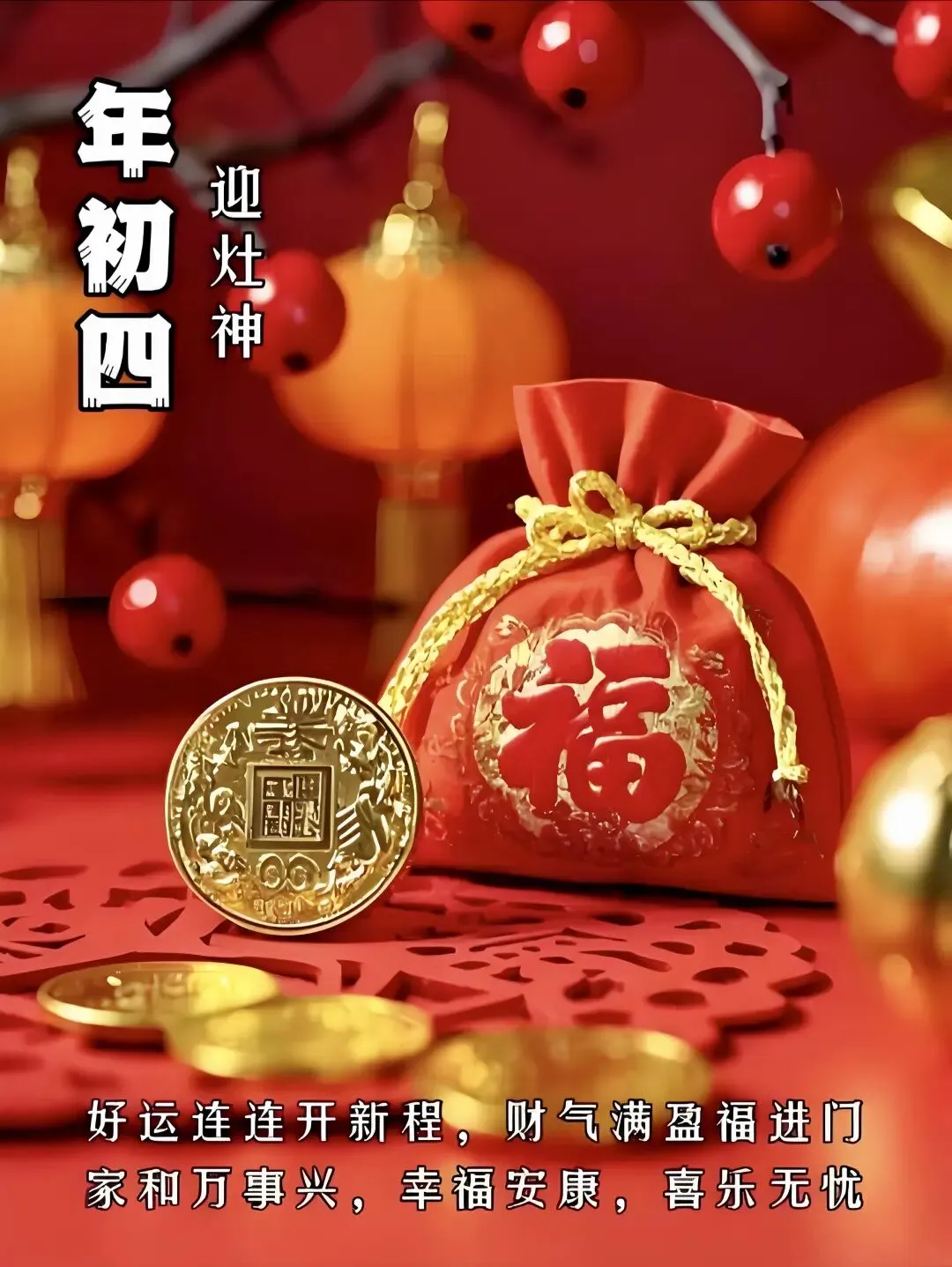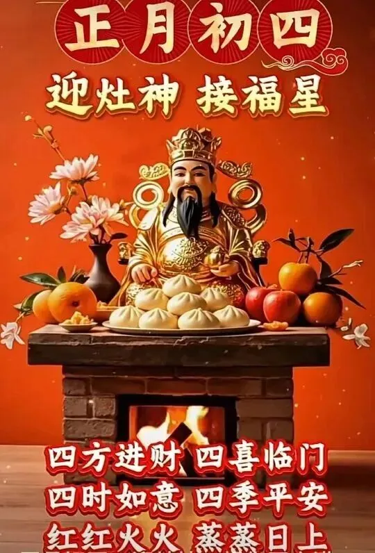 大年初四,迎灶神,尝美食,五谷丰登福满门;喜神到,福星照,烦恼忧愁都忘掉;新的一年吃嘛嘛香,顺风顺水顺财神。早上好!🌹🍎🙏🌺🌞🎉