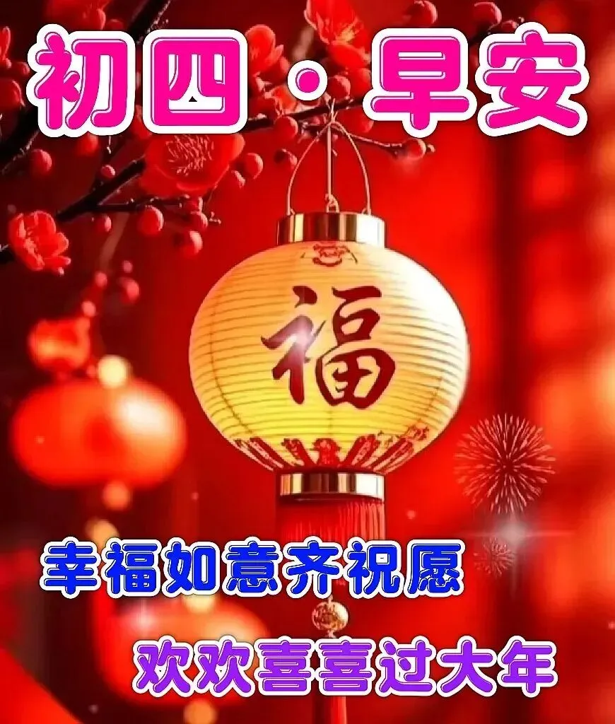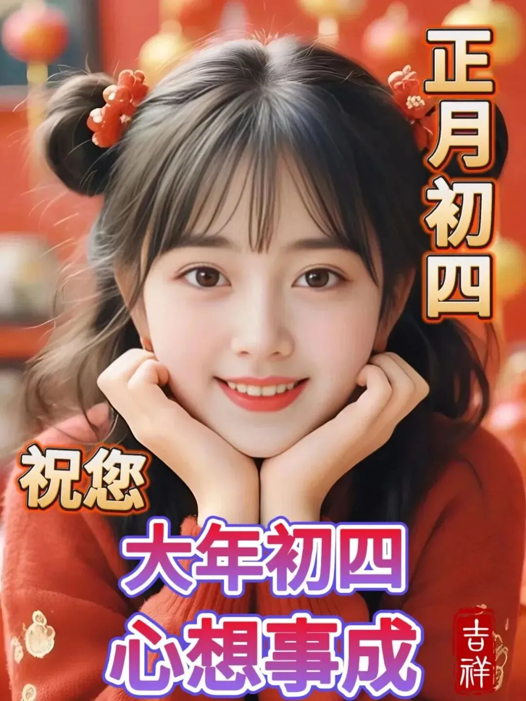 大年初四祝福你,新年时刻伴好运,心想事成事事顺,天天幸福甜如蜜,四季平安吉祥随,快乐健康伴一生!早安吉祥!