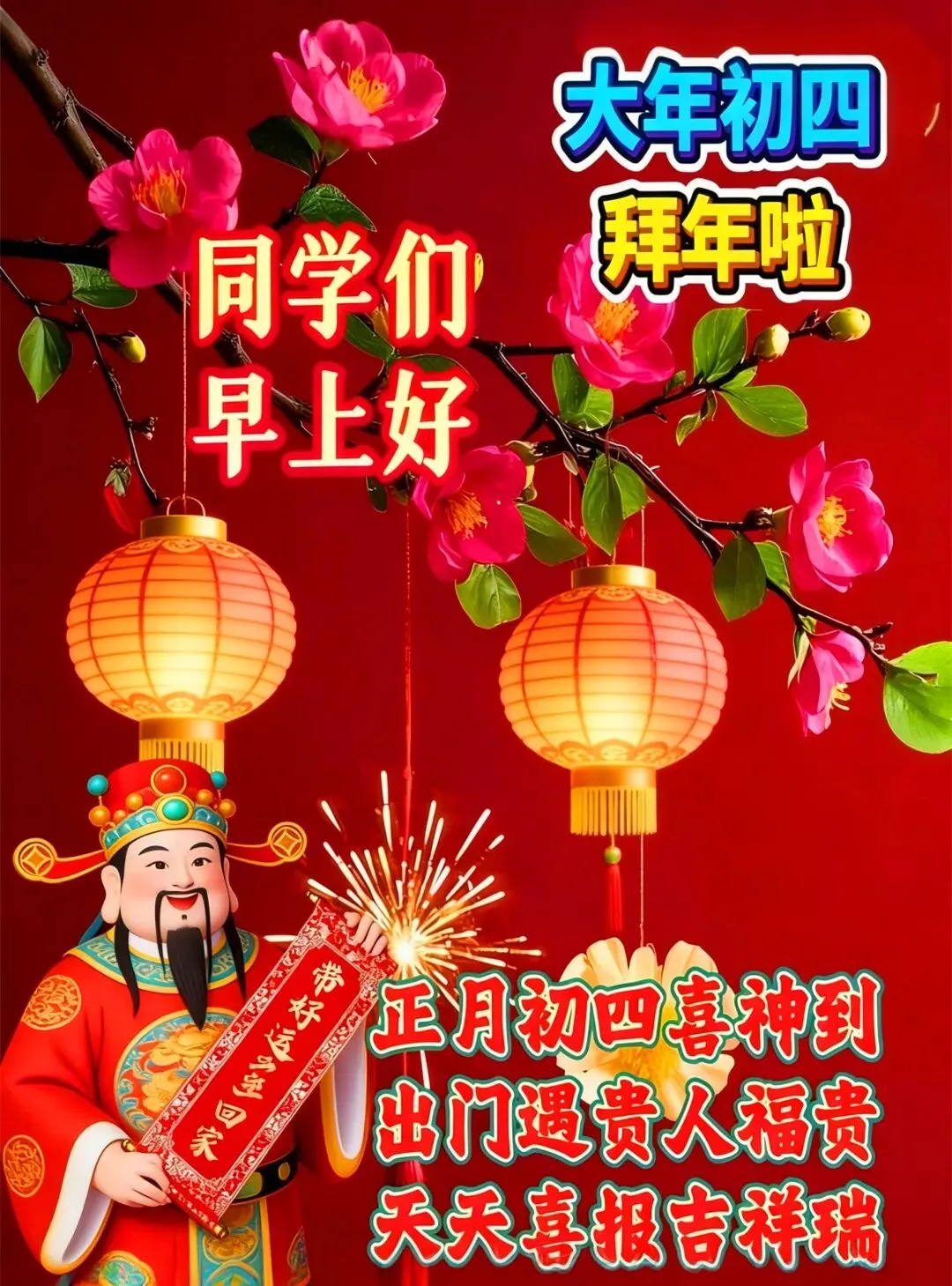 正月初四迎财神,灶神到我家,保佑我家财源滚滚来,好运连连,四季平安,四季发财,快乐健康永相伴,万事如意!