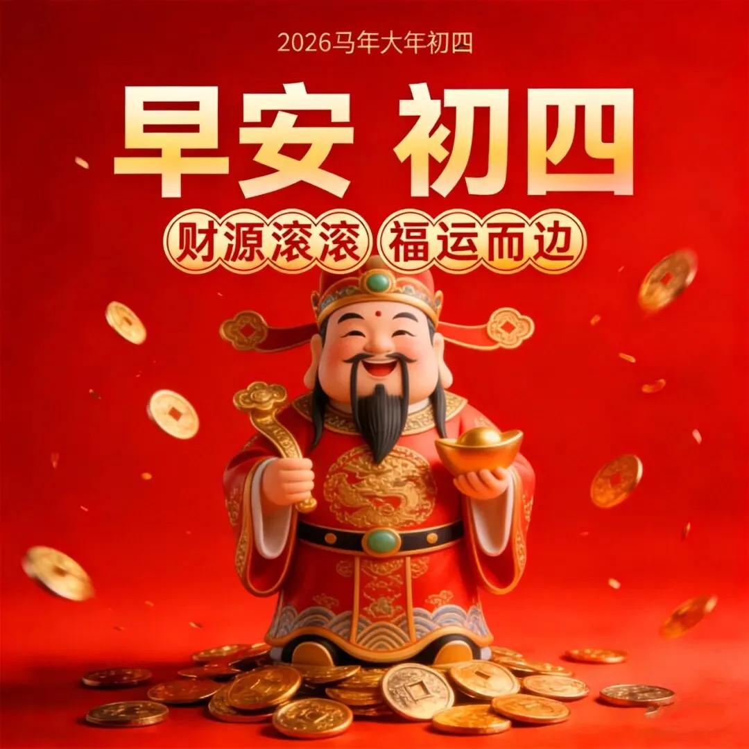 今天农历正月初四,灶神下凡的大好日子,在这里祝福你,开心快乐,喜事连连。2026好运不断!