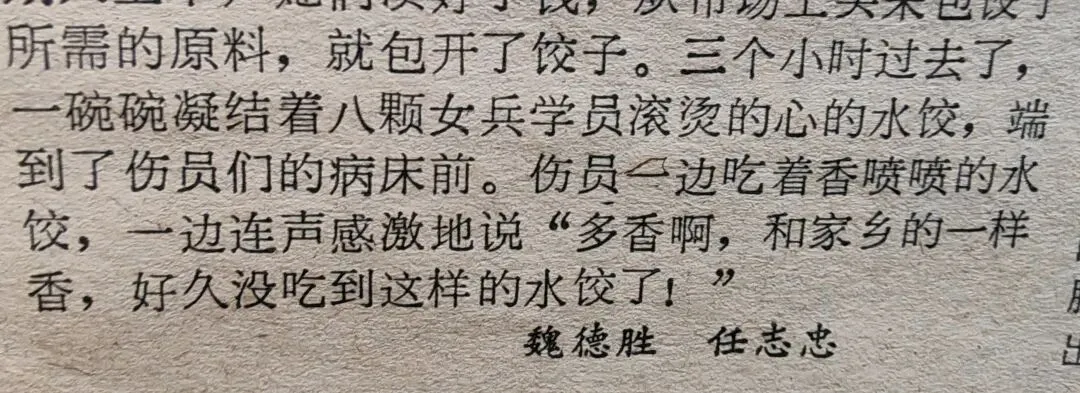 星期天上午,她们凑好了钱,从市场上买来包饺子所需的原料,便动手包了起来。三个小时过去了,一碗碗凝结着8颗军医学校学员滚烫心意的水饺,端到了伤员们的病床前。伤员们一边吃着香喷喷的水饺,一边连声感激地说:“多香啊!和家乡的一样,好久没吃到这样的水饺了!”