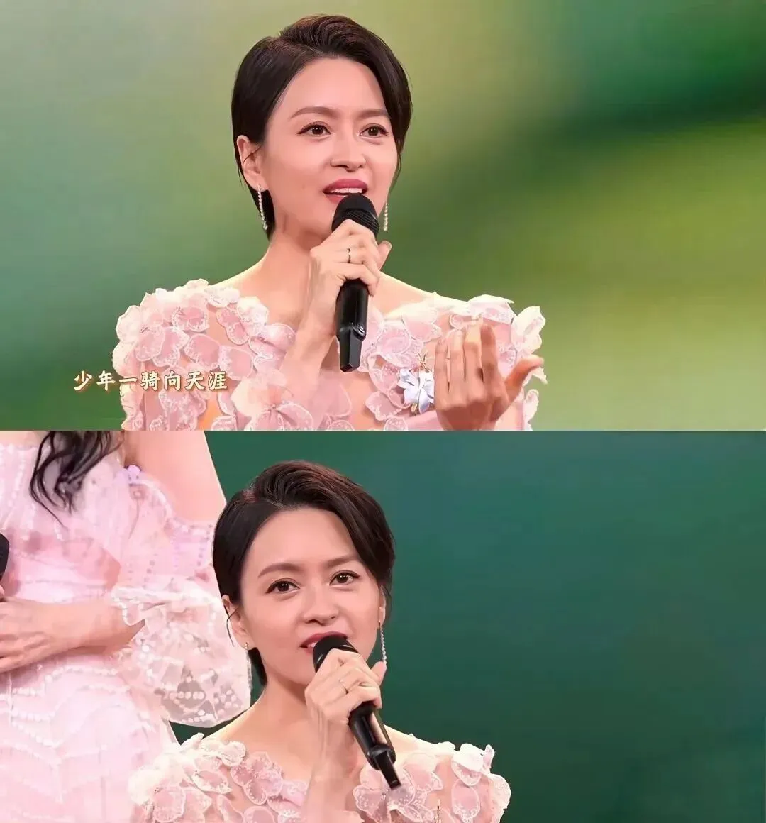 她依旧是那头标志性的利落短发,搭配一袭修身粉裙,173cm 的身姿亭亭玉立。清亮的音色融入舒缓旋律,笑容清澈如溪,举手投足间满是知性温婉