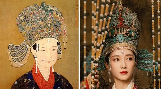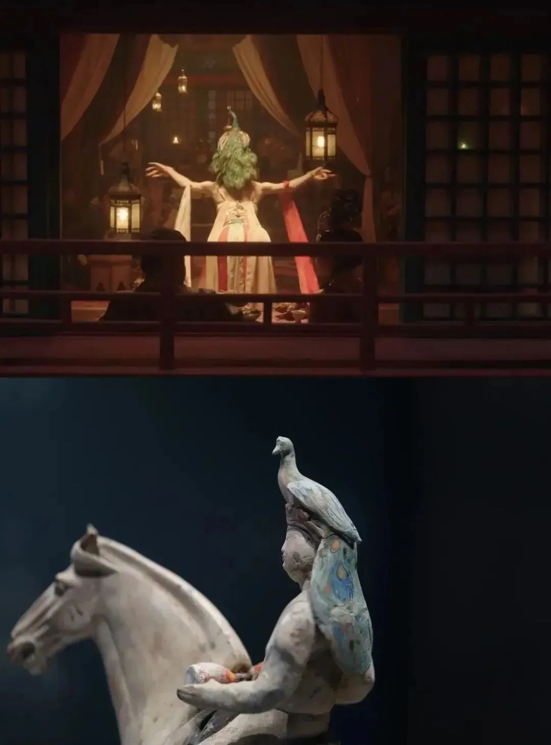 剧中舞姬头戴的孔雀冠,原型来自西安博物院所藏的一件唐代骑马击腰鼓女俑;