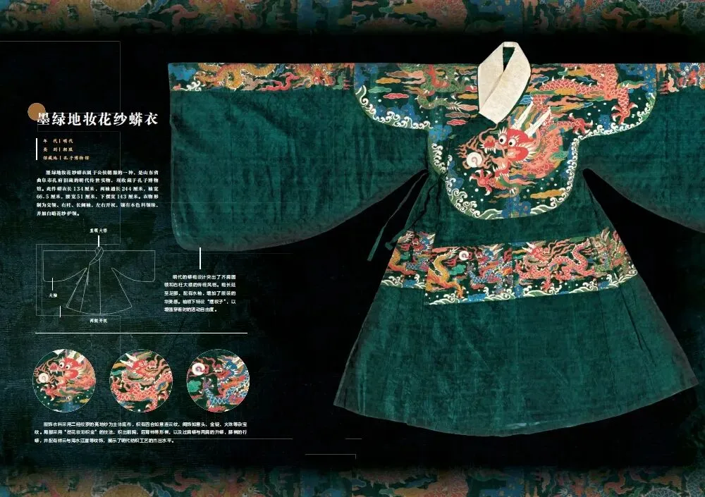 墨绿地妆花纱蟒衣属于公侯朝服的一种,是山东省曲阜市孔府旧藏的明代传世实物,现收藏于孔子博物馆。