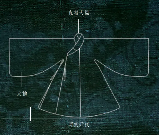 衣物形制为交领、右衽、长阔袖,左右开衩,镶有本色料领缘,并加白暗花纱护领。