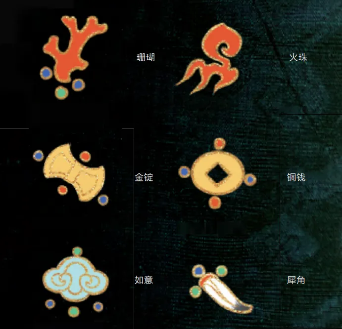明代的杂宝纹是一种经典的吉祥纹样,图案取自各种宝物,如金锭、犀角、火珠、珊瑚等,由于形象繁多且可以任意择用,因此被称为“杂宝”。