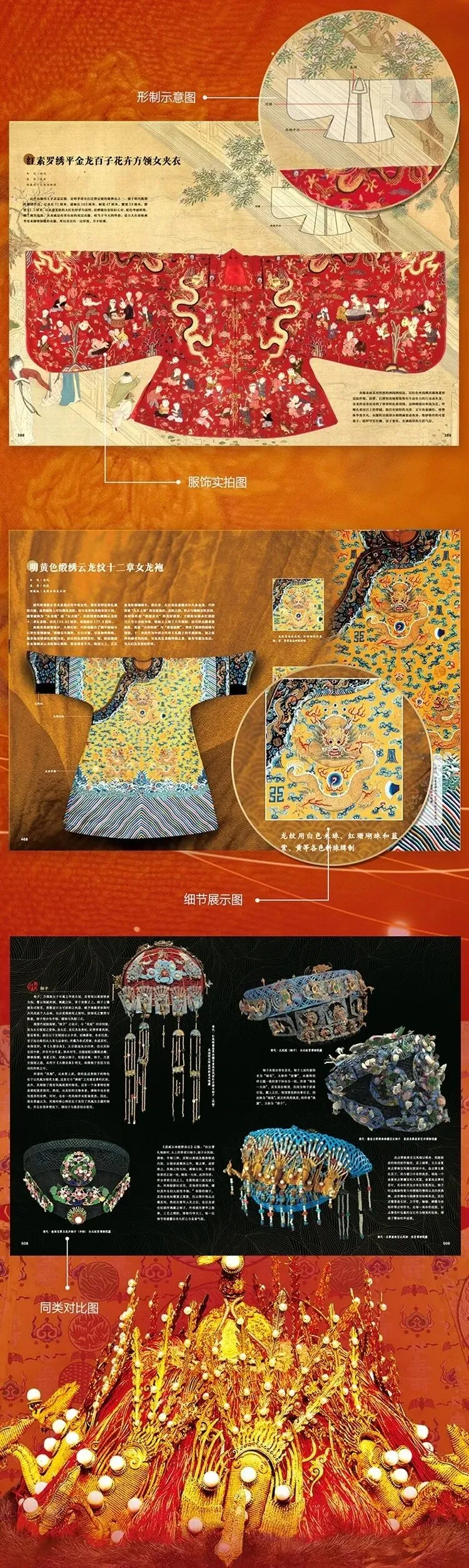 书中全方位呈现了服饰实拍图、形制示意图、纹样线稿图、细节展示图、同类对比图等超多类型、信息量爆炸的精彩图片,很多都是满页、跨页的高清彩图,真正的“纸上”360度实景参观体验。