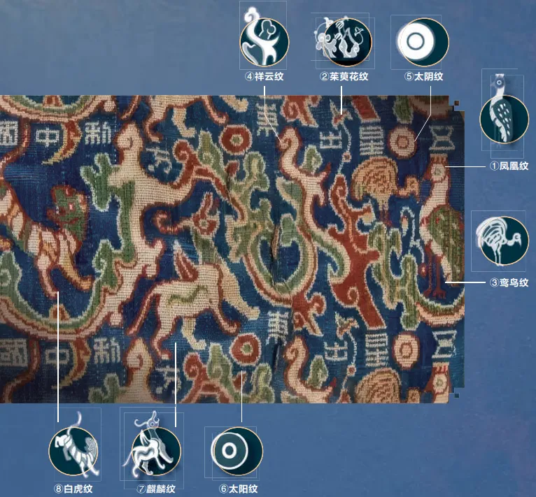 织锦用鲜艳的青、白、赤、黄、绿五色,在青色的底布上织出了汉式图案,包括云气纹、鸟兽、辟邪和代表日月的红白圆形纹。