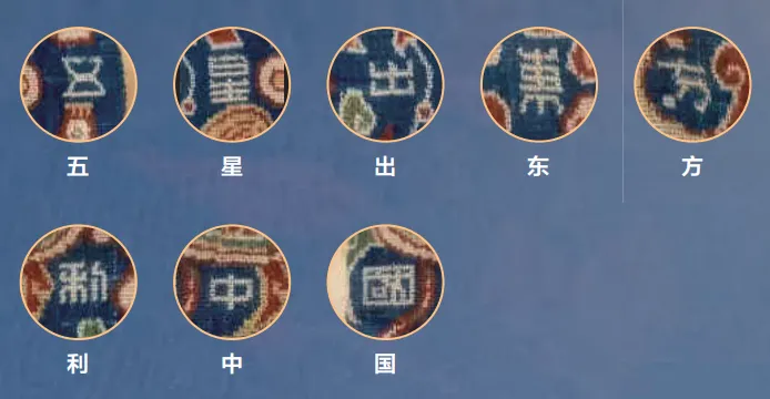 它呈圆角长方形,以独特的“五星出东方利中国”织锦为面料,边缘用白绢镶边。织锦上,八个篆体汉字清晰可见,充满古朴之美。
