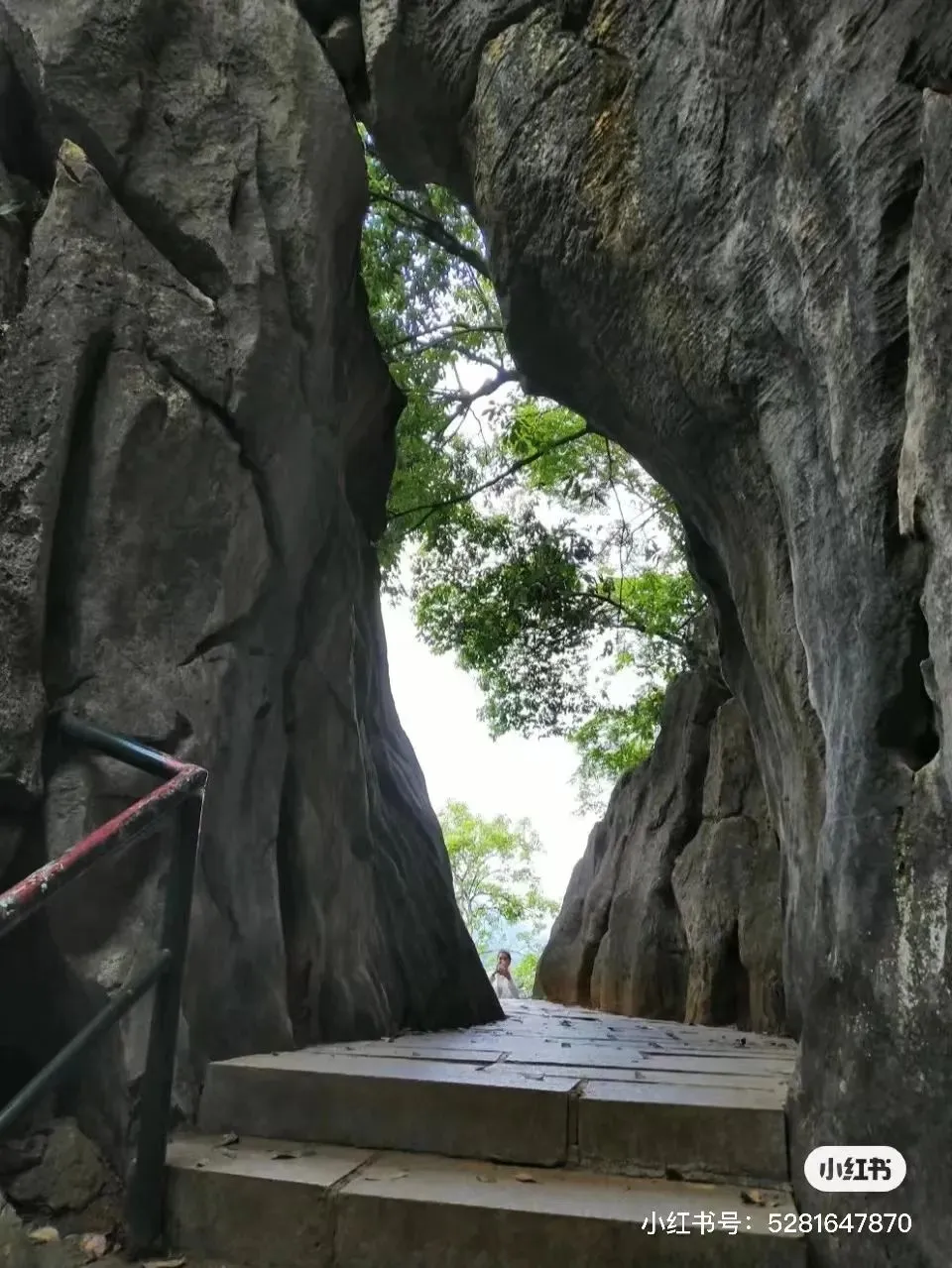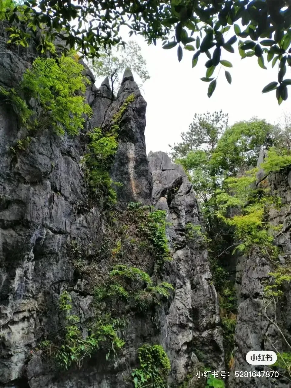 鳞隐石林总面积1.85平方公里,独特的喀斯特地貌造就了地上石林、地下迷宫的奇异景观。石林发育于石炭--二迭纪的石灰岩里,高的达36米,低者2—3米,形态各异,有孤立的柱状、塔状、锥状,也有共一基座的丛状、笔架状,有平顶的、尖顶的,有的是光滑的柱状而顶部却是密集的锯齿状溶沟和石芽,有的灰岩裸露,有的罩着一层藤本植物盘缠的披纱,美丽而壮观。