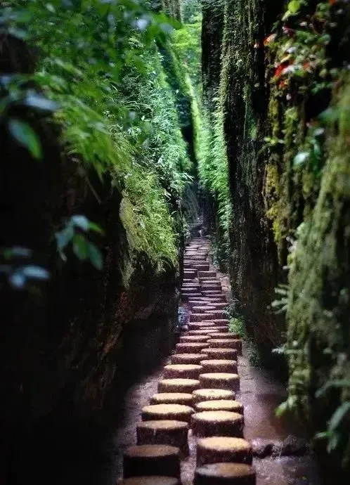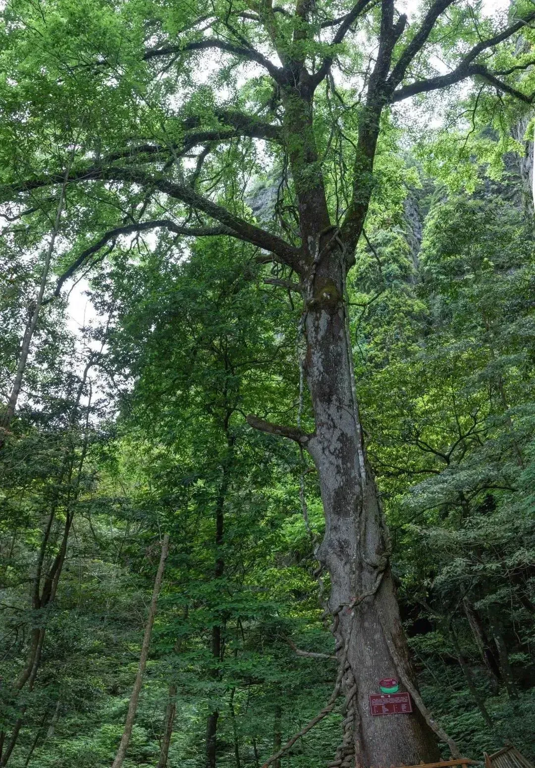 森林中有着参天古树,树龄已有千年之久。最著名的是古枫树,枝干粗壮,需要三四个人才能环抱。走进贵妃谷,硕大的石峰中间笔直裂开一缝,密密麻麻的花草顺势分开两边,曲径通幽。