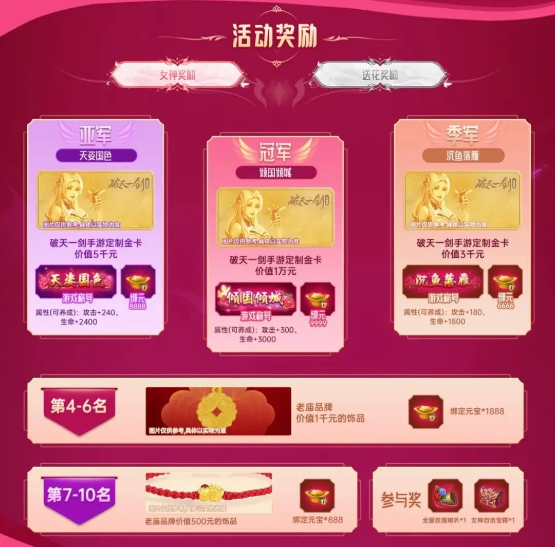 前三名的奖励除了绑元,还会收到专属特别游戏称号和破天一剑手游定制金卡!