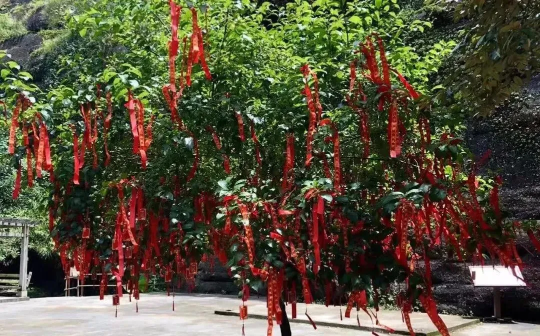 森林中有着参天古树,树龄已有千年之久。最著名的是古枫树,枝干粗壮,需要三四个人才能环抱。走进贵妃谷,硕大的石峰中间笔直裂开一缝,密密麻麻的花草顺势分开两边,曲径通幽。