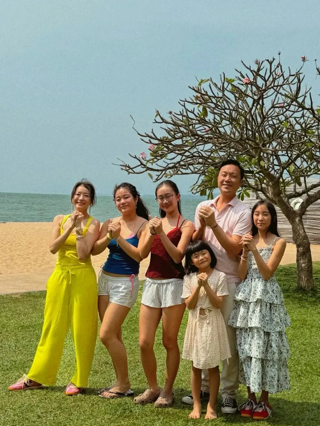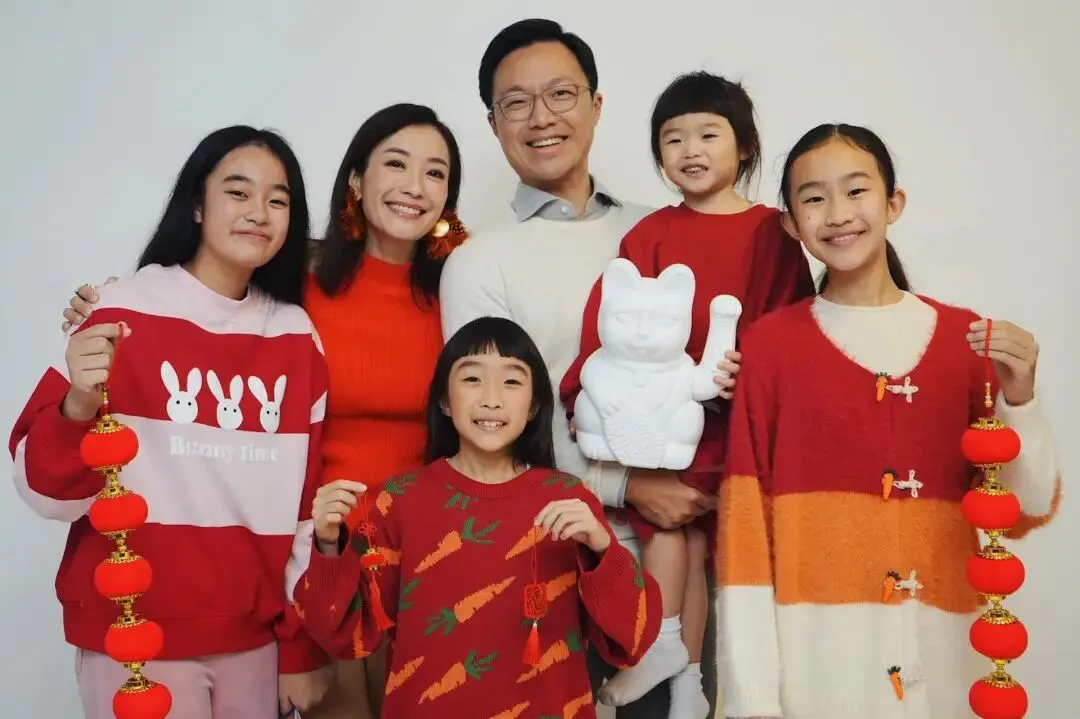從楊張新悅分享的照片可見,一家人換上夏日裝束。最令人驚訝的是,兩名大女已經長得亭亭玉立,齊齊展示美腿,目測身高更已直逼媽咪;至於兩位年紀較小的女兒則乖巧地依靠在爸爸身邊。一家六口對鏡頭拱手作揖向網民送上新春祝福,每位成員都笑容燦爛,流露出幸福之情。