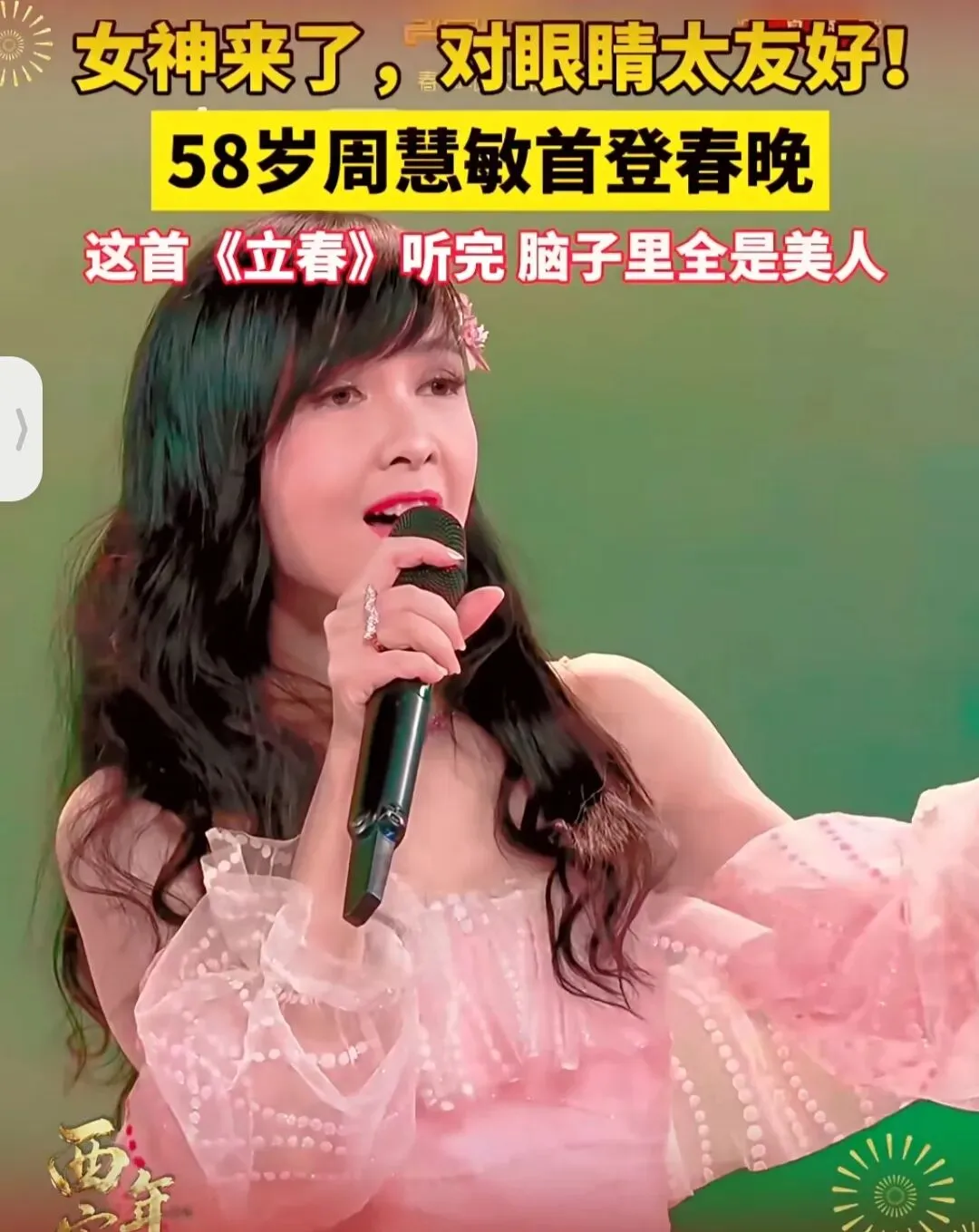 我最喜欢周慧敏。作为台上年纪最长的姐姐,她的状态却好到让人失语。脸上只有岁月精心呵护的细腻与通透。一袭粉裙站在C位,标志性的黑发披肩,央视镜头下的每一寸肌肤都透着健康的光泽。