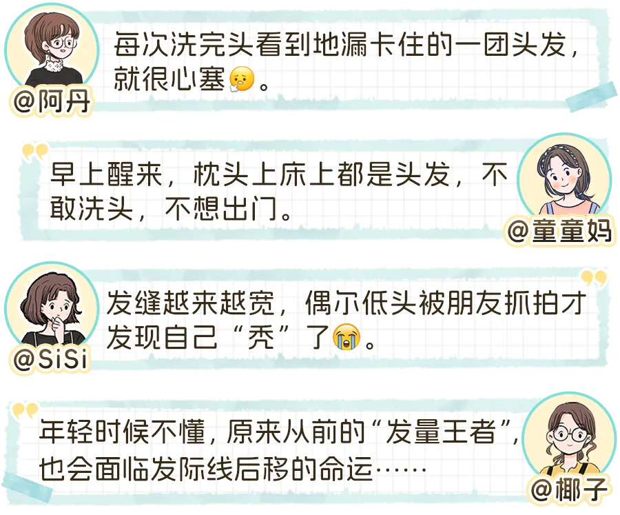 最难受的是掉发!真的不夸张,洗一次头、梳一次头、吹一次头,地上都能捡出一小撮,“哗哗掉”的那种无力感,采访一圈全是同款“愁人”👇️