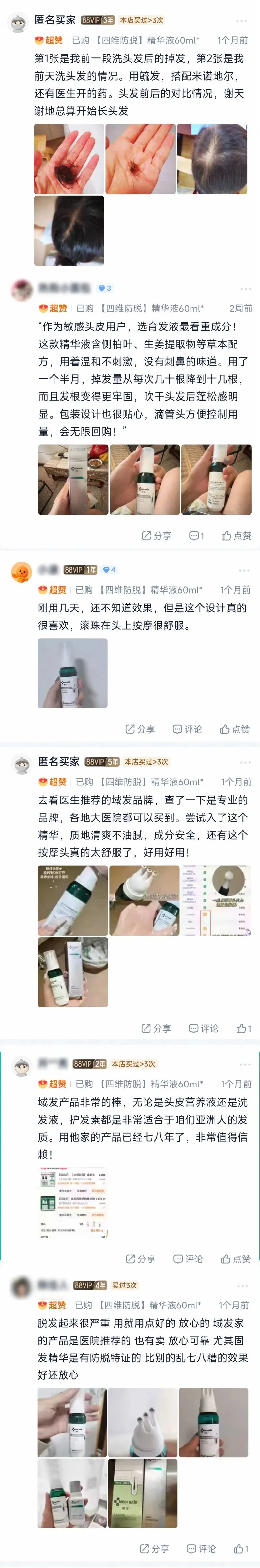 买家秀里好多在晒前后对比,还有在说“🧑‍⚕️推荐”“防脱效果好”“发缝收拢了”“用完头皮清爽”“老品牌值得信任”。